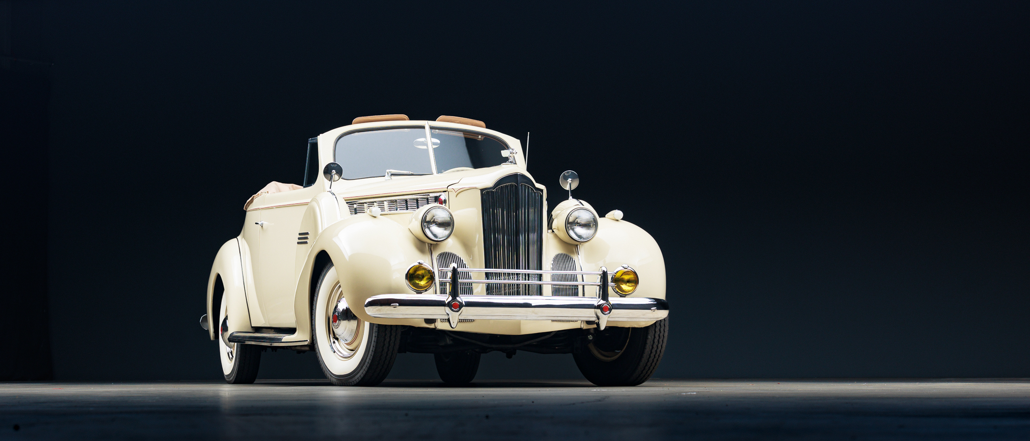 The body is said to have been repainted in its current cream shade with red pinstriping approximately two decades ago, and the body seals and tan convertible top were reportedly replaced over the course of the long-term refurbishment that was initiated in 2000. Features include a V-shaped windshield, a Goddess of Speed hood ornament, amber fog lamps, a double badge bar, and a fold-down rear luggage rack.