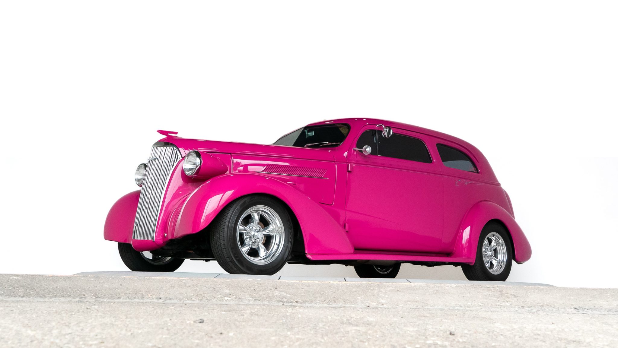 Chrome-finished American Racing 15” wheels are mounted with 205/60 Toyo Tourevo LS II tires up front and 235/60 Super Sport Futura GLS units out back. A Mustang II-style front subframe with power-assisted rack-and-pinion steering has been added, and the live rear axle is supported by longitudinal leaf springs. Braking is handled by front discs and rear drums.