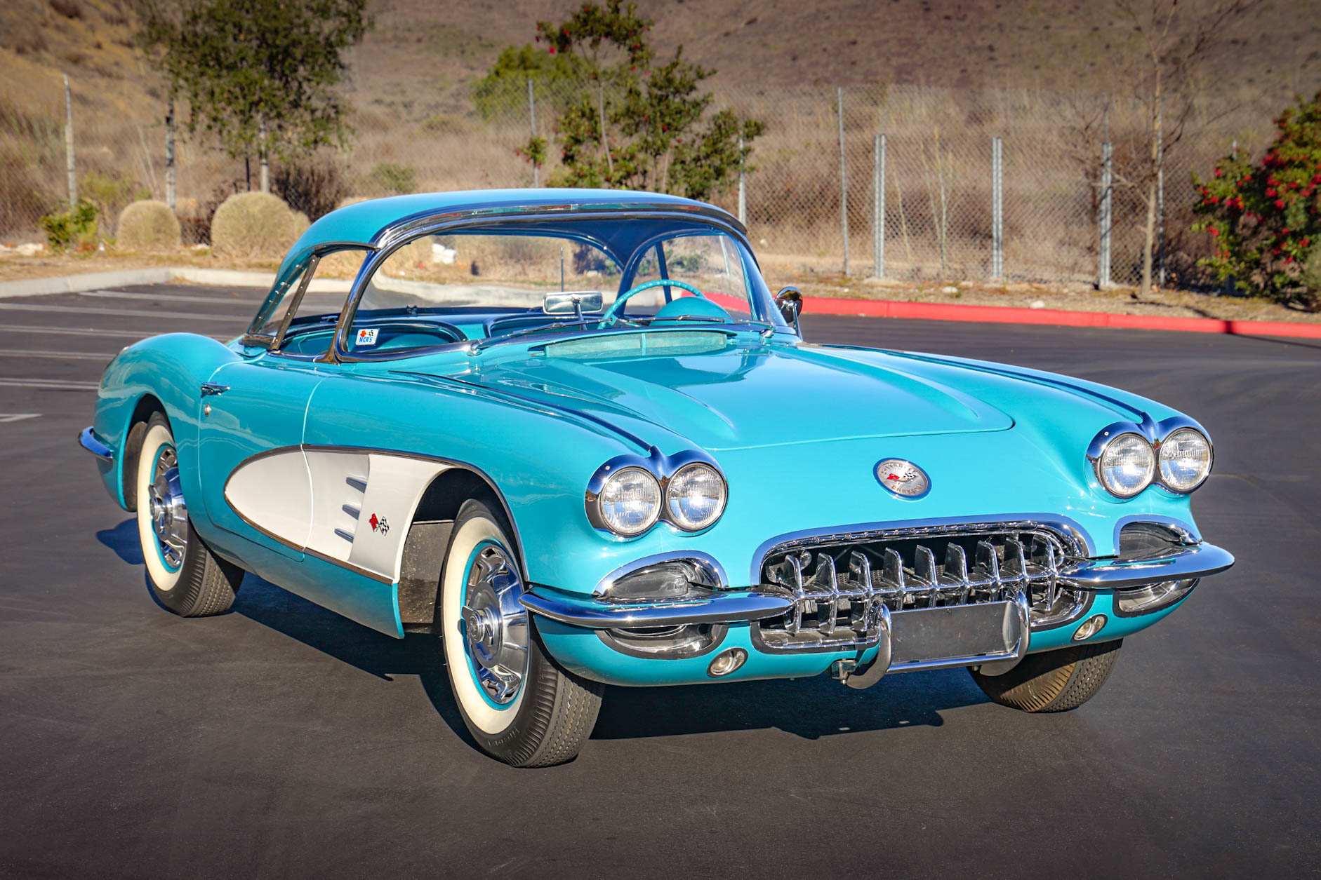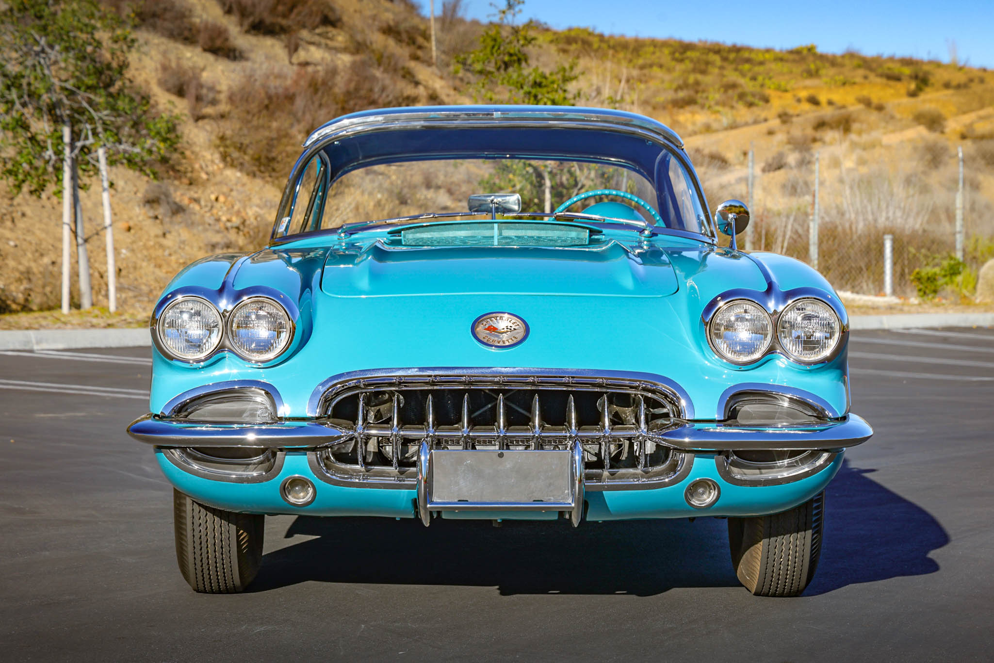 Body-color 15″ steel wheels feature spinner-style covers and are mounted with Firestone Deluxe Champion whitewall tires. The car came equipped from the factory with an independent front suspension and semi-elliptical rear leaf springs.
