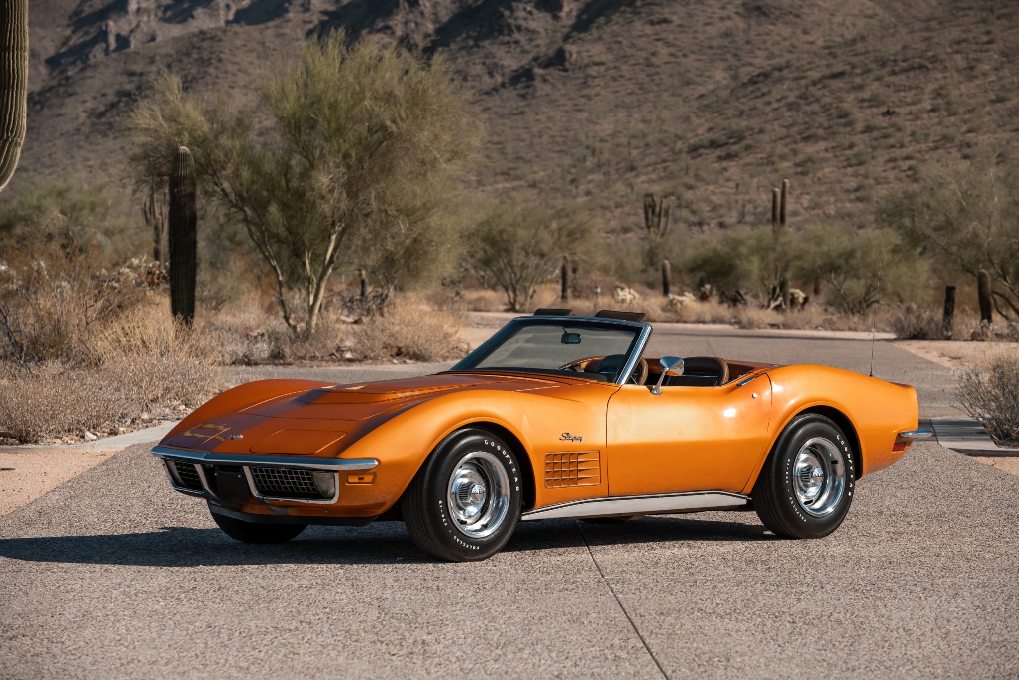 The 15″ Rally wheels wear chrome trim rings and center caps and are mounted with F70-15 Goodyear Polyglas white-letter tires. Stopping power is provided by power-assisted ventilated rotors at each corner, and the car is equipped with a fully independent suspension.