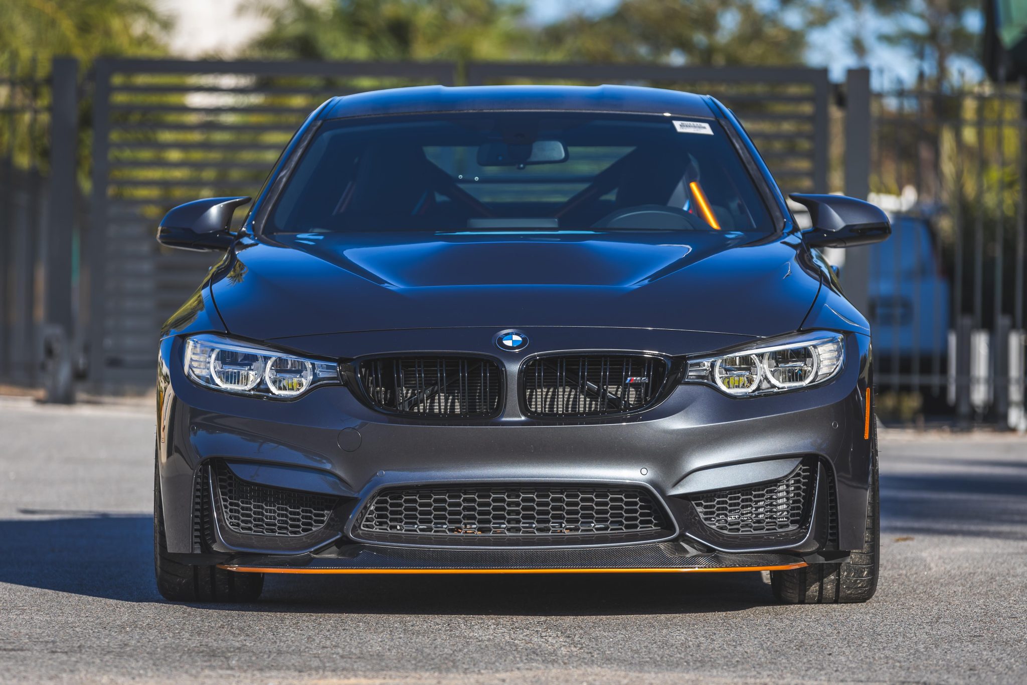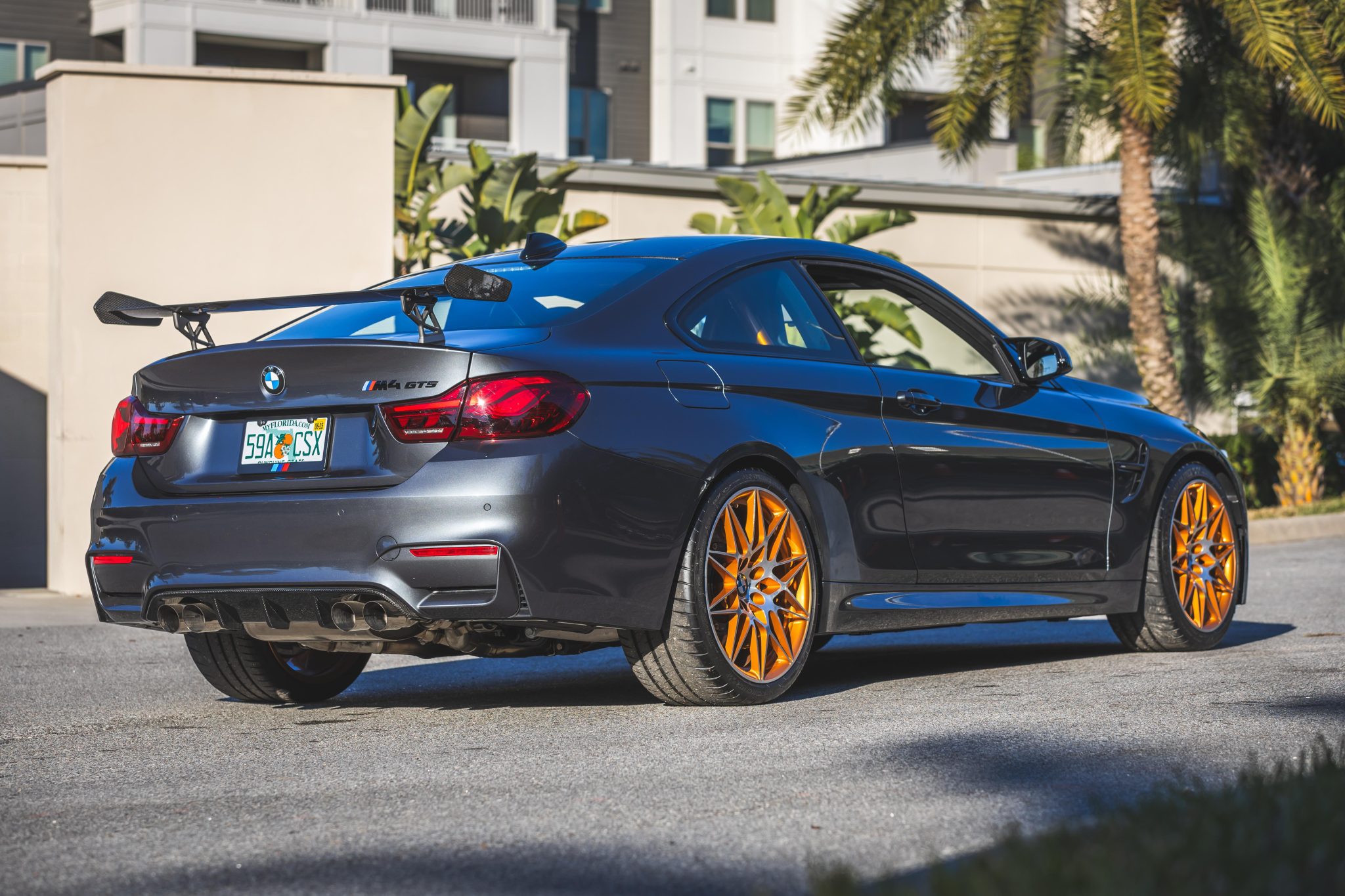 Acid Orange 20″ Style 666M alloy wheels are mounted with Michelin Pilot Sport Cup 2 tires. Braking is handled by gold-finished M-branded calipers over cross-drilled and ventilated M ceramic-composite discs at each corner. A three-way adjustable M coilover suspension was standard equipment on the GTS.