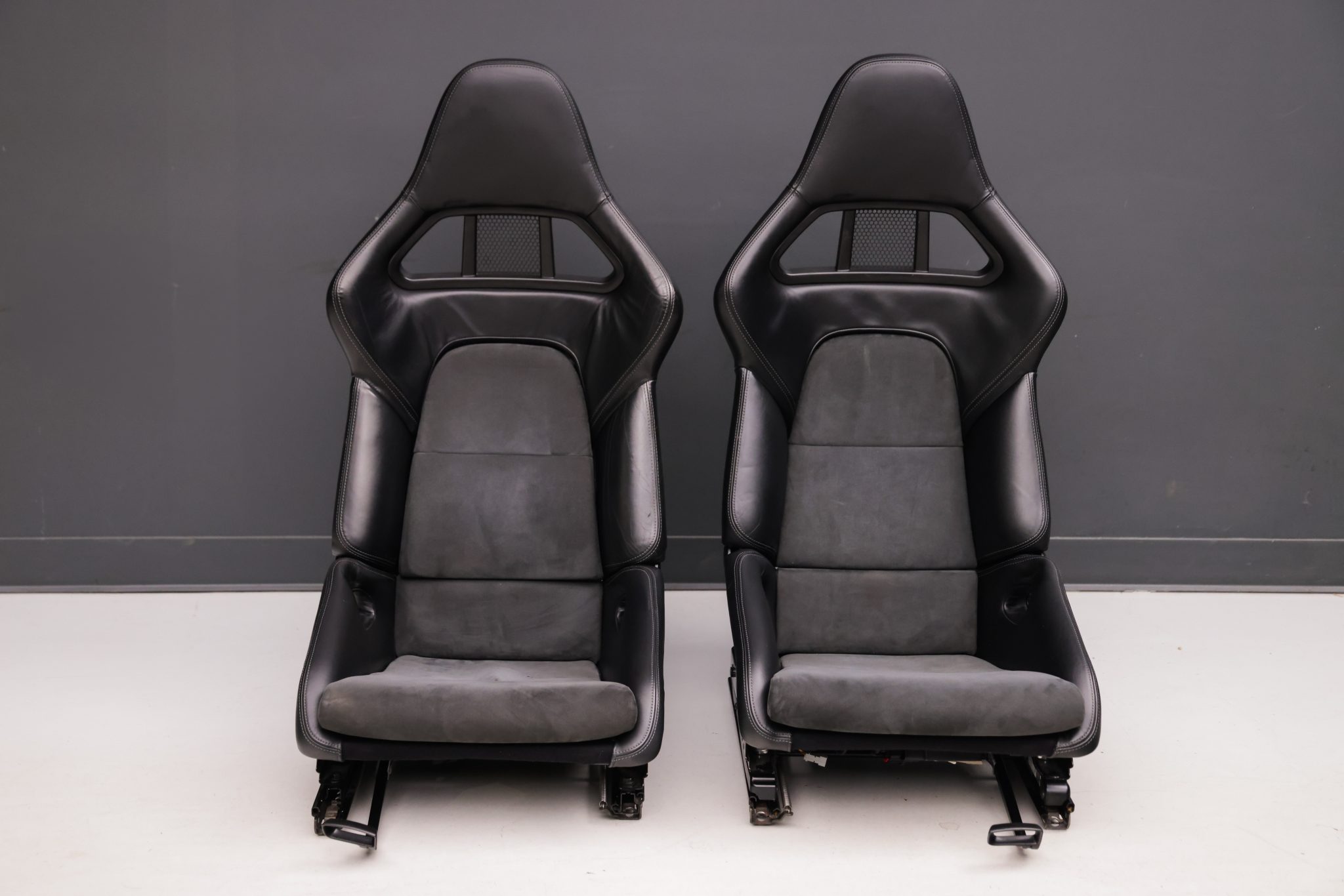 Gloss-finished carbon-fiber covers the fiberglass and carbon-fiber-reinforced plastic seat shells. Leather pull straps are located behind the outer shoulder bolsters to assist with folding the adjustable backrests forward.