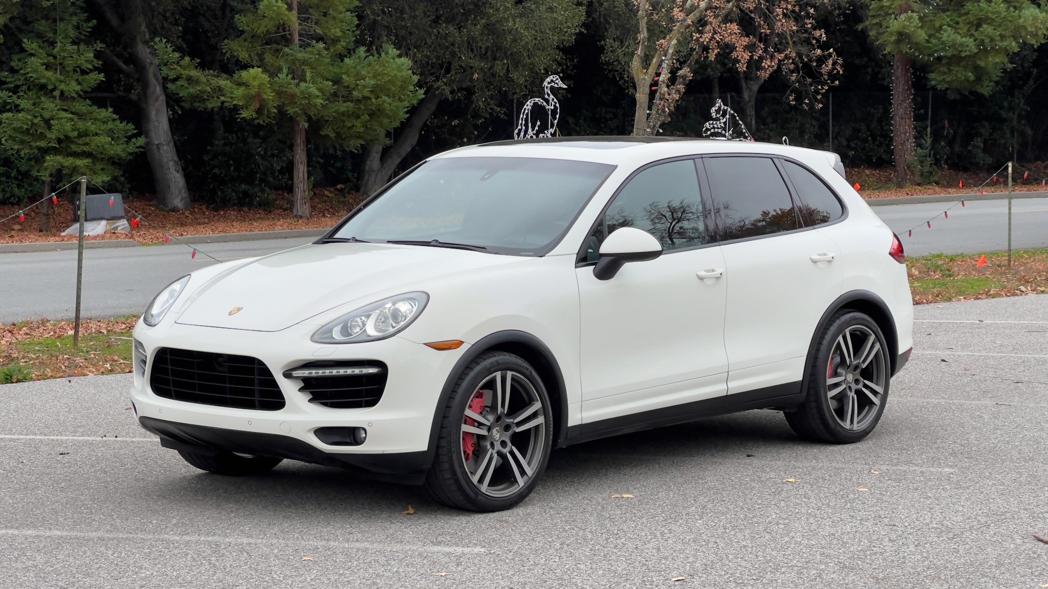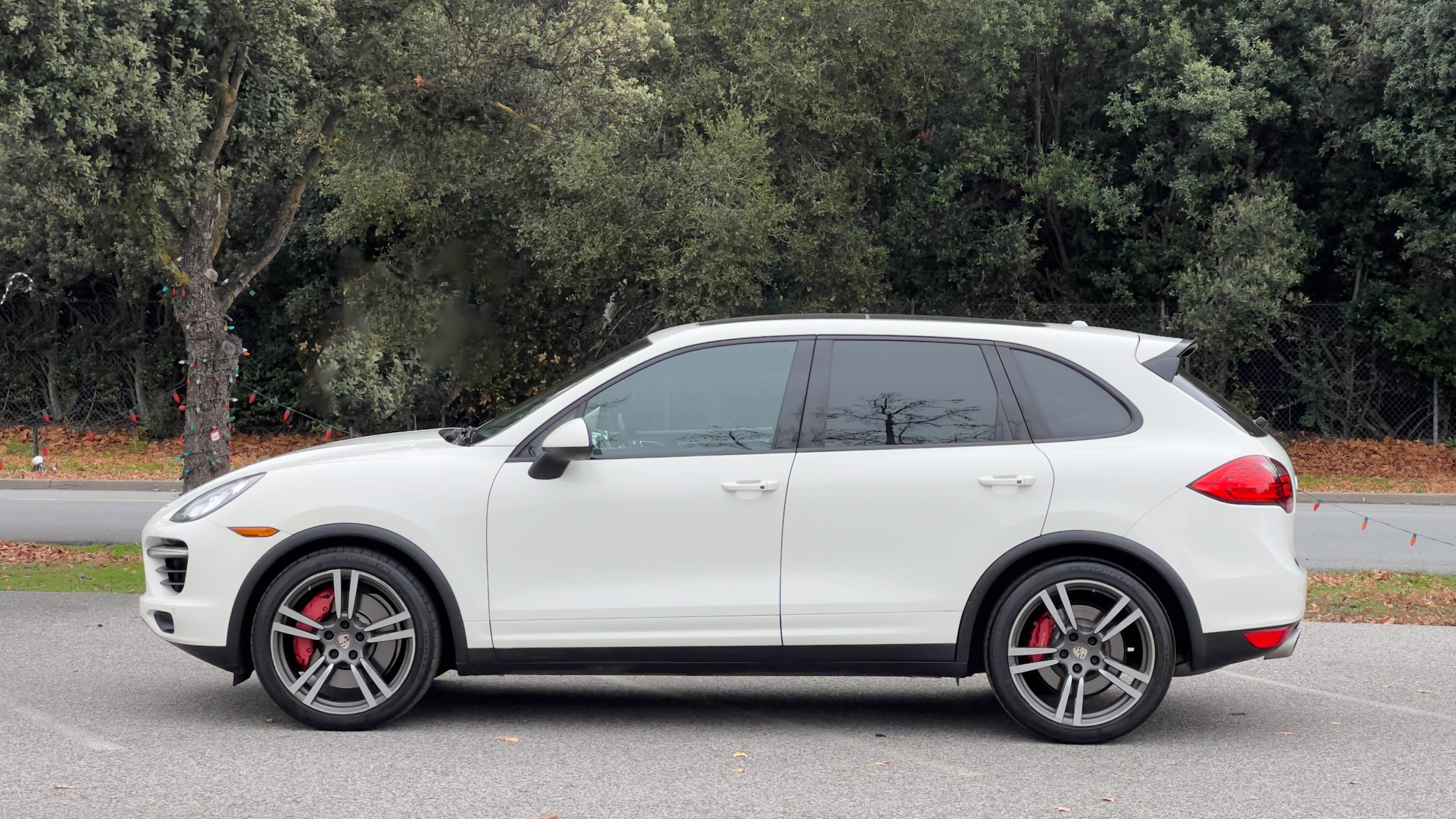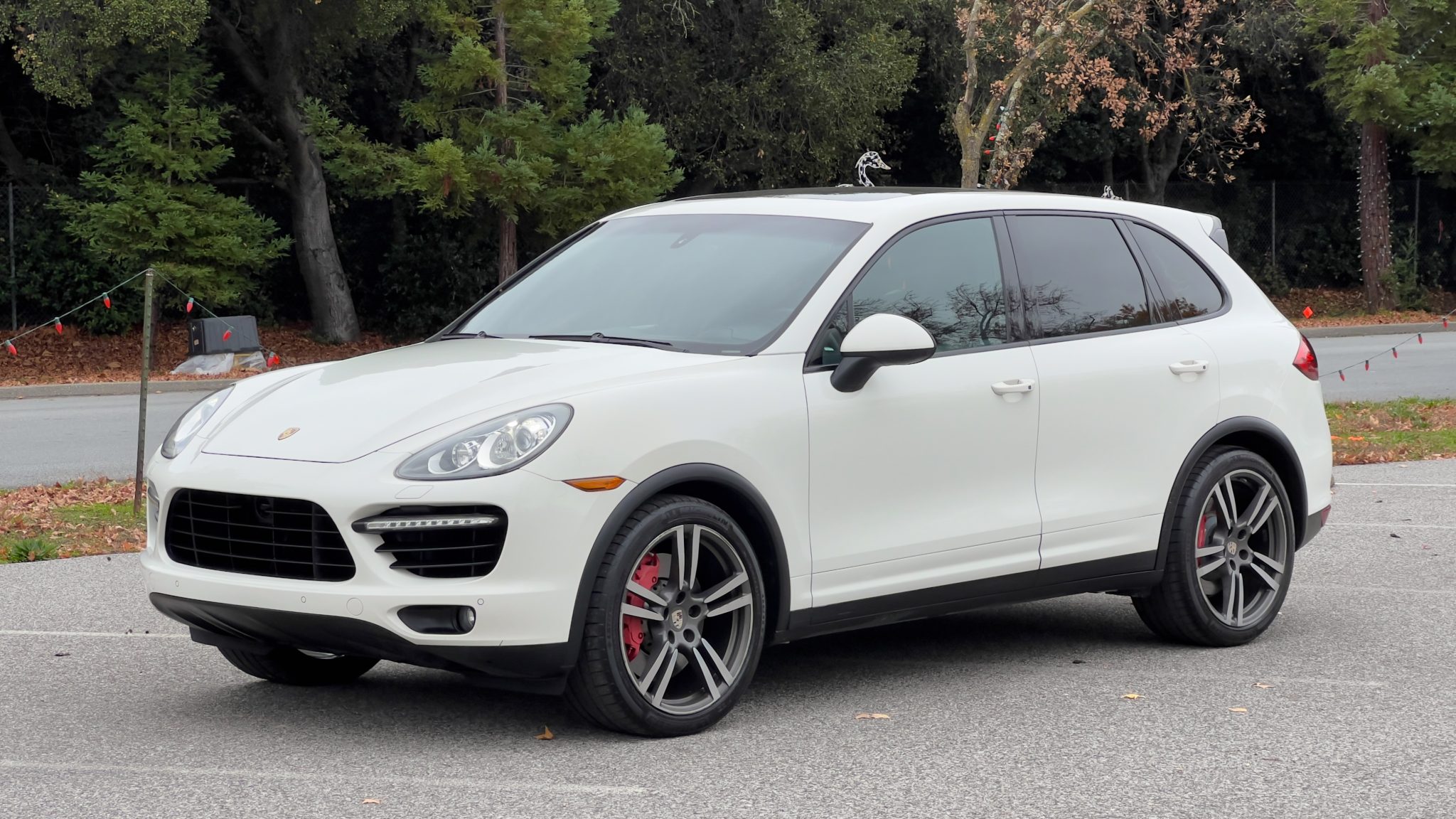 The 21″ 911 Turbo II alloy wheels are mounted with a mix of Michelin Latitude Sport tires. The vehicle is equipped with an adjustable air suspension, Porsche Dynamic Chassis Control (PDCC), Porsche Active Suspension Management (PASM), and Power Steering Plus. Stopping power is provided by red-finished six-piston front and four-piston rear brake calipers over ventilated rotors at each corner.