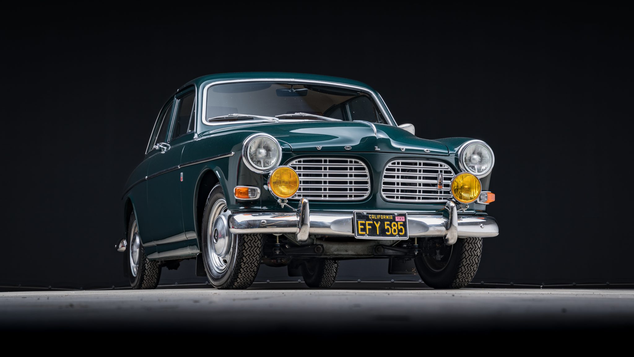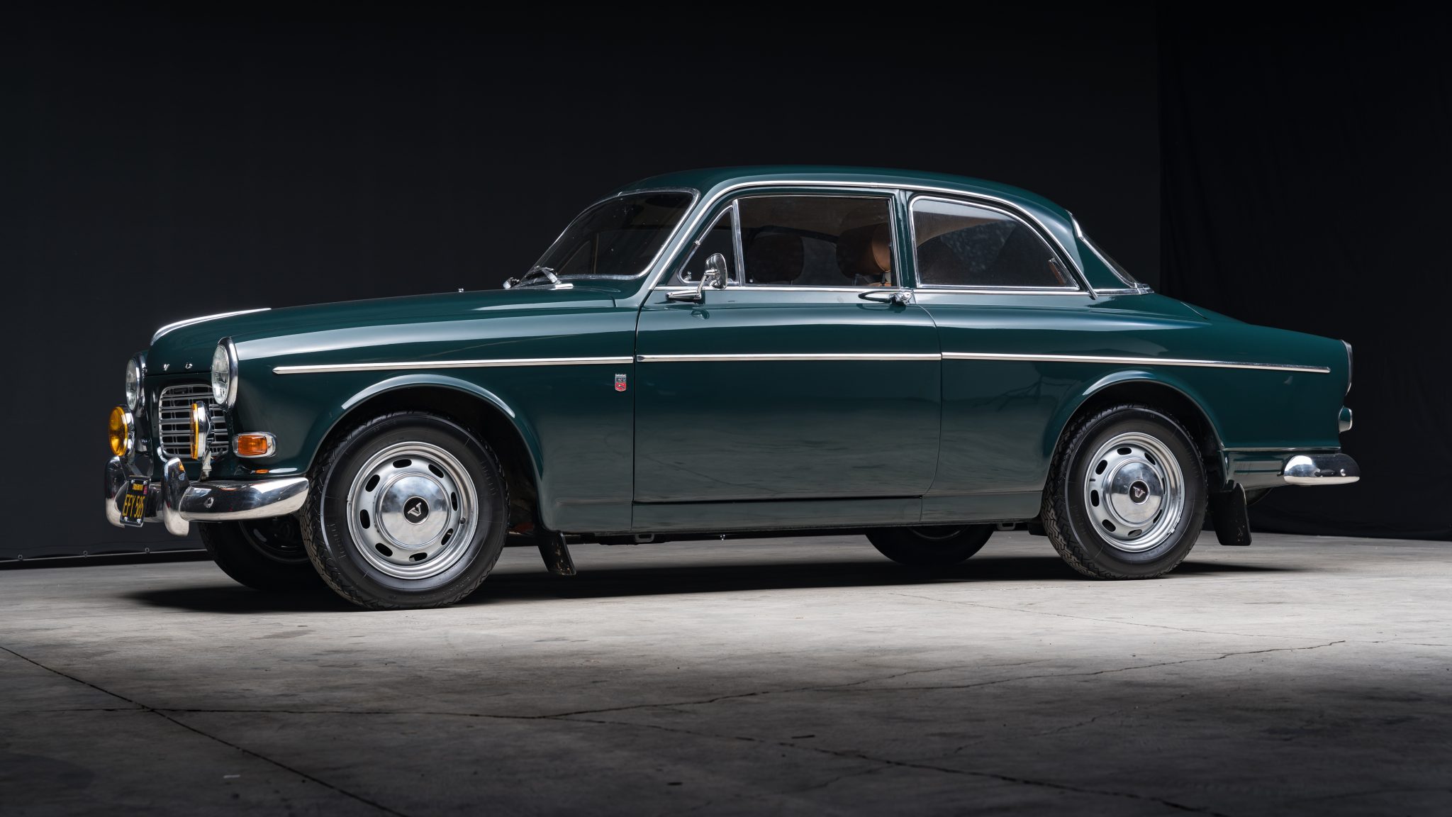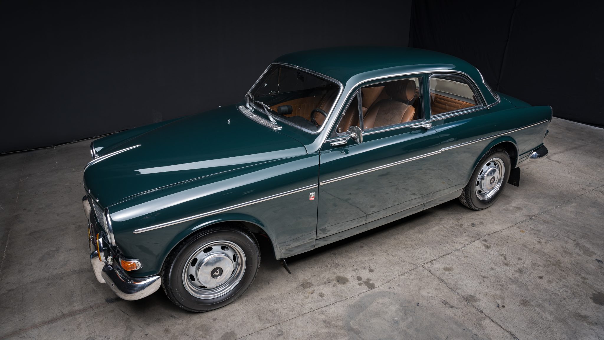 Silver-finished 15″ slotted steel wheels with polished hubcaps sourced from a 122 wagon have been added, and they were mounted with 165-series Pirelli Cinturato tires in August 2023. Chassis modifications consist of an IPD front sway bar, Progressive Suspension springs, and Koni shocks. Disc brakes are fitted at each corner, and the rear brake pads were replaced in July 2021.