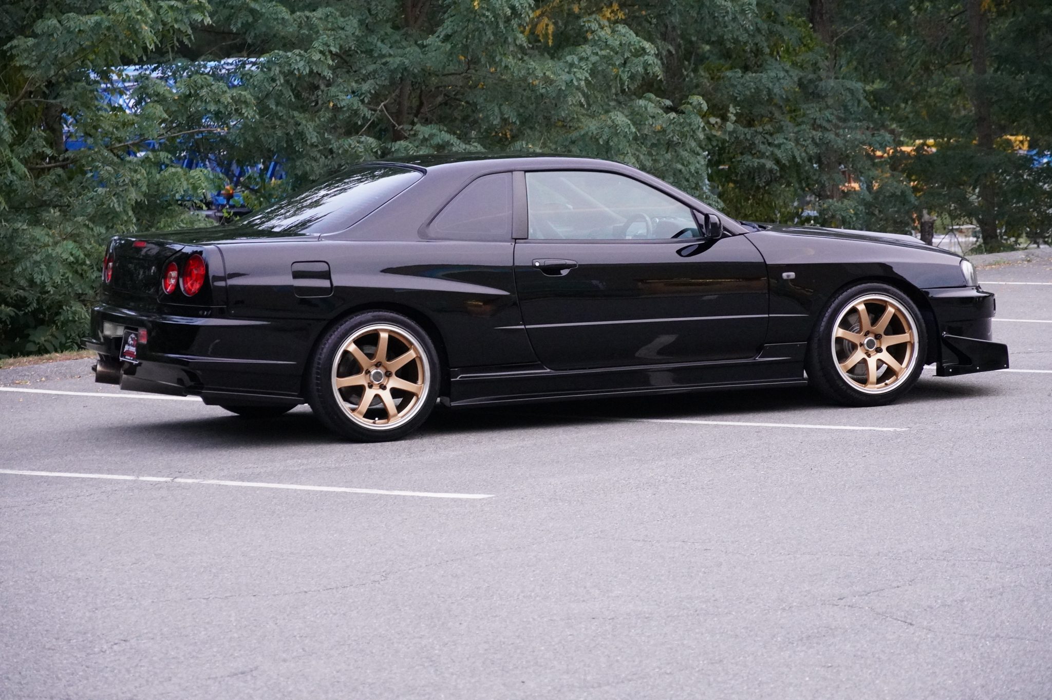 Gravity-branded 18″ gold alloy wheels were mounted with Hankook Ventus V12 evo2 tires by the selling dealer. The car came equipped with HICAS four-wheel steering from the factory, and stopping power is provided by four-wheel discs. The selling dealer states modifications include Brembo-branded brake calipers and aftermarket suspension arms. The rear sway bar links were replaced in September 2024.