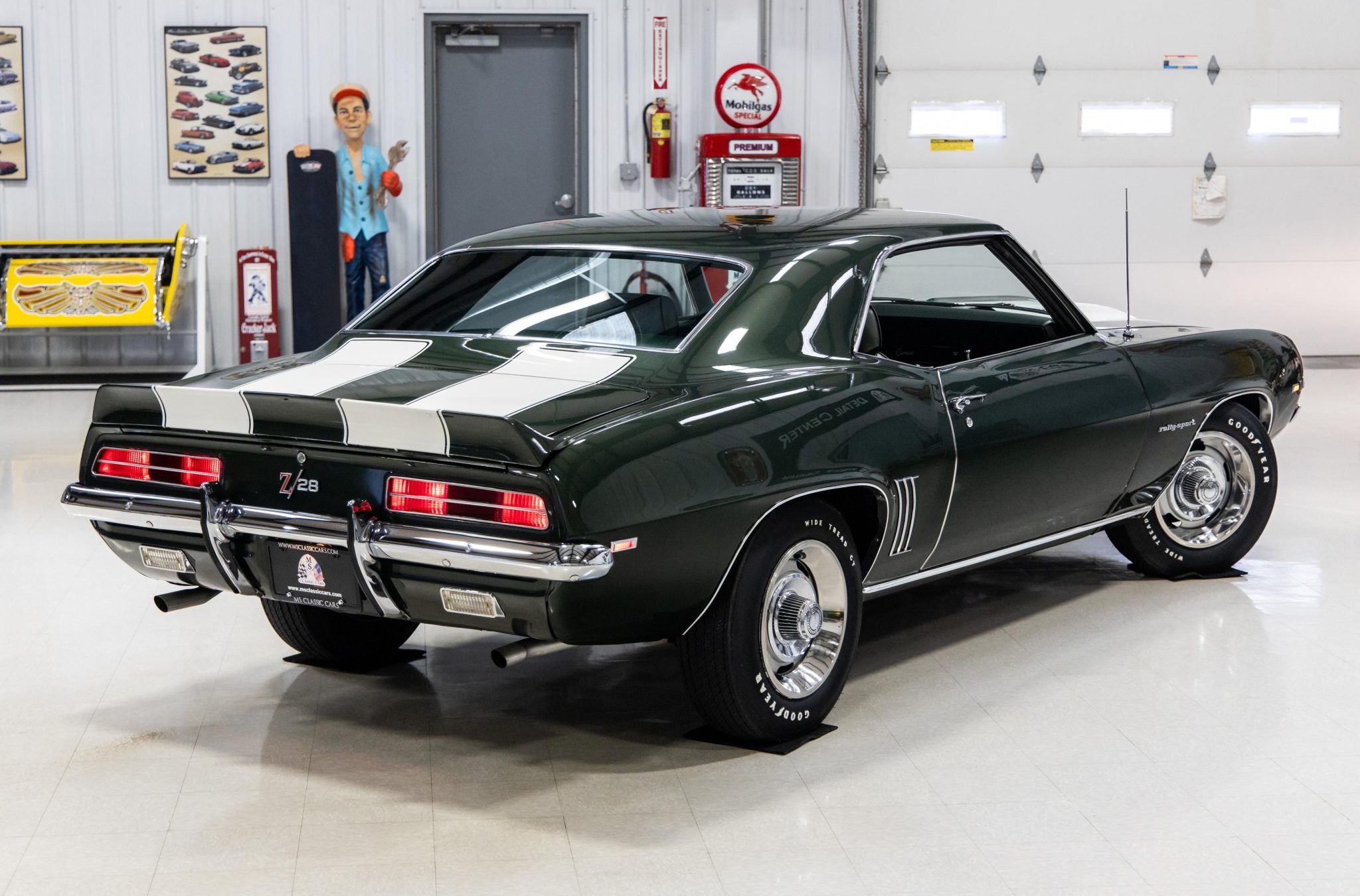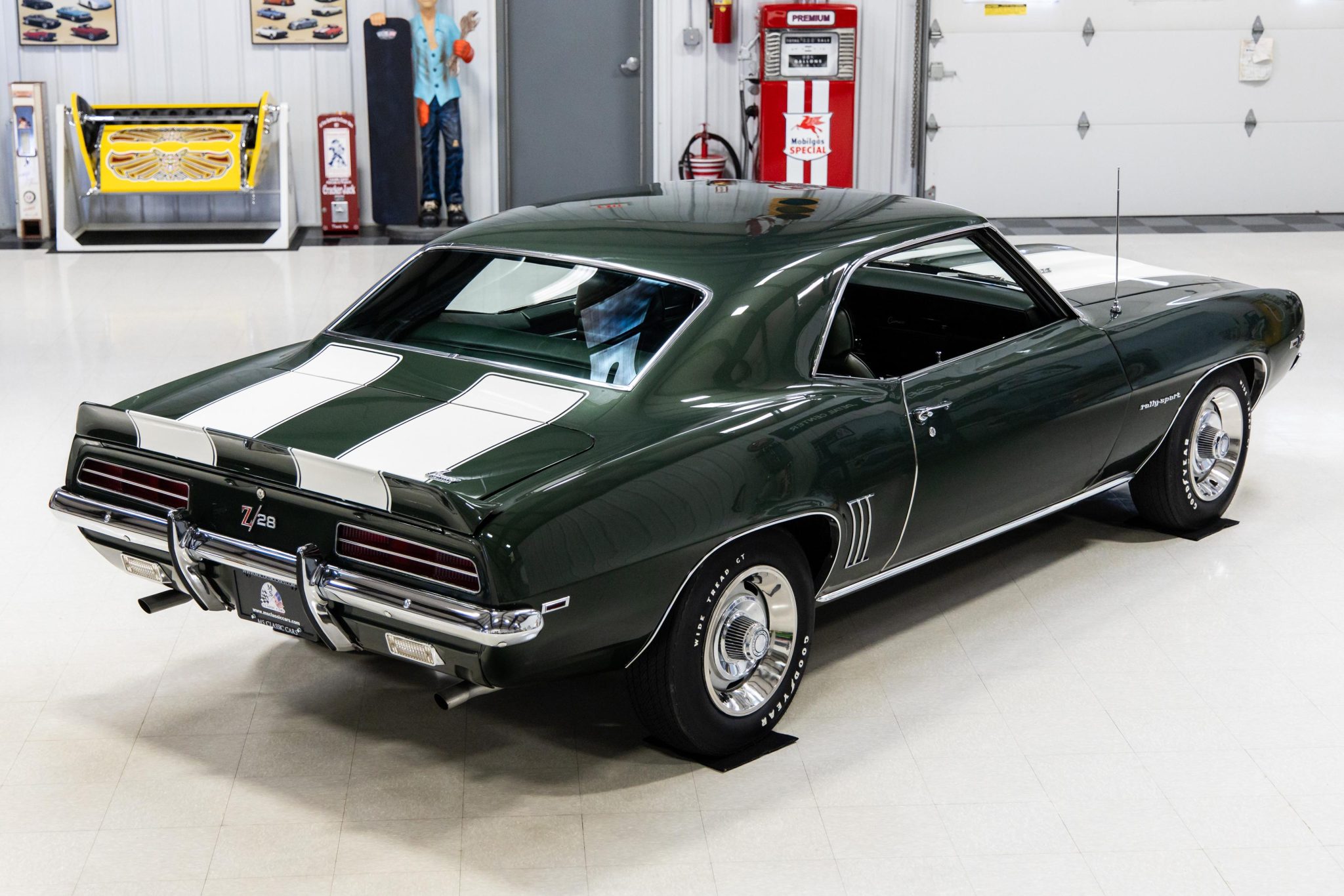 Silver-finished 15″ Rally wheels wearing bright trim rings and center caps were mounted with Goodyear Wide Tread GT white-letter tires in preparation for the sale, and a full-size spare wrapped in a BFGoodrich tire is stowed in the trunk. The steering is power-assisted, as are the front disc and rear drum brakes.