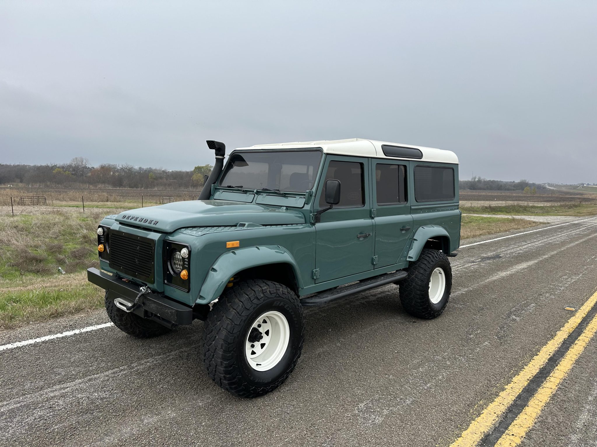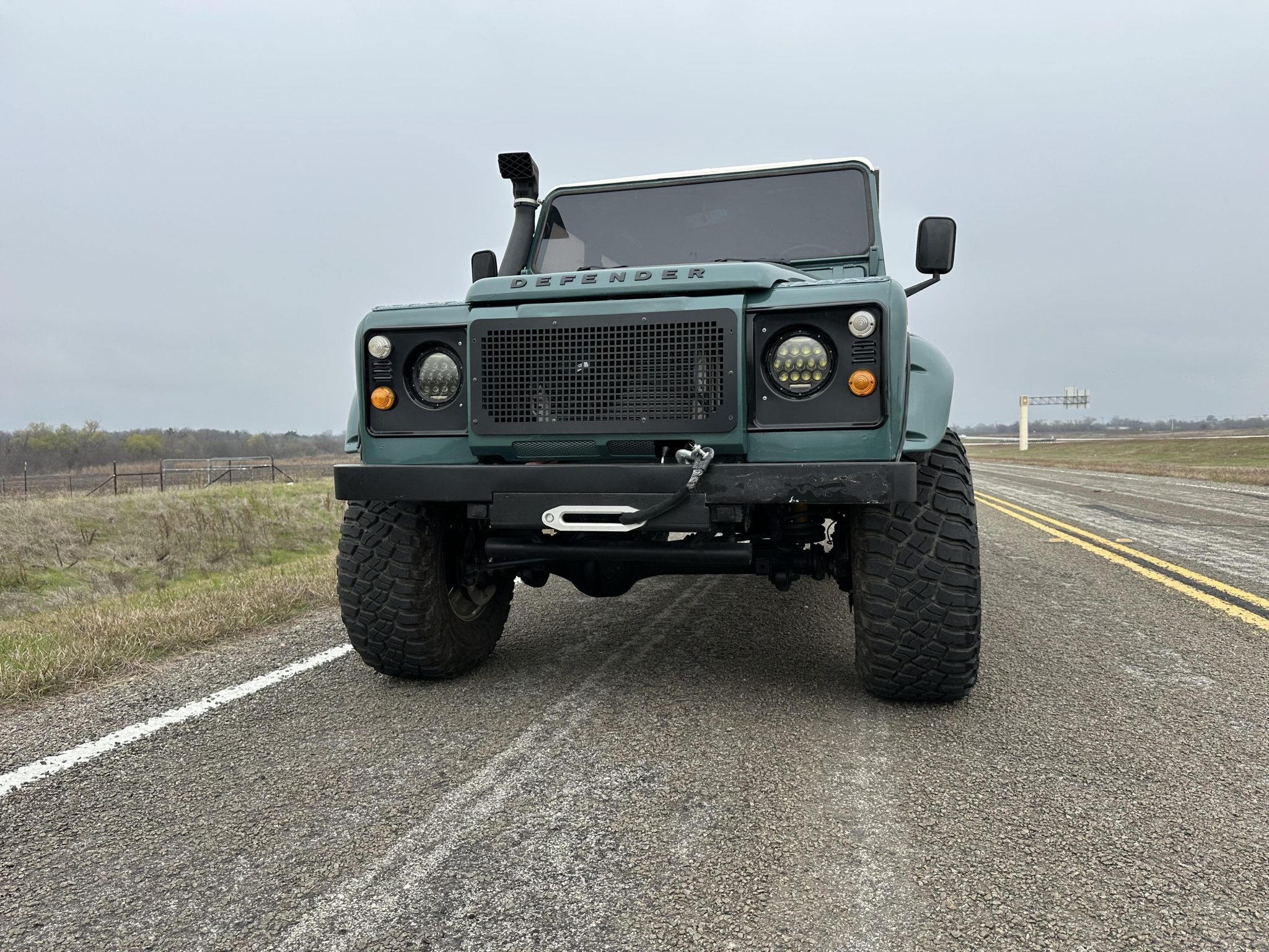 The 16″ steel wheels are mounted with 315/75 BFGoodrich Mud-Terrain T/A KM3 tires, and a spare with a Land Rover-branded cover is secured to a swing-out carrier at the rear of the truck. The suspension has been lifted, and four-wheel disc brakes and aftermarket shocks and springs have been installed.
