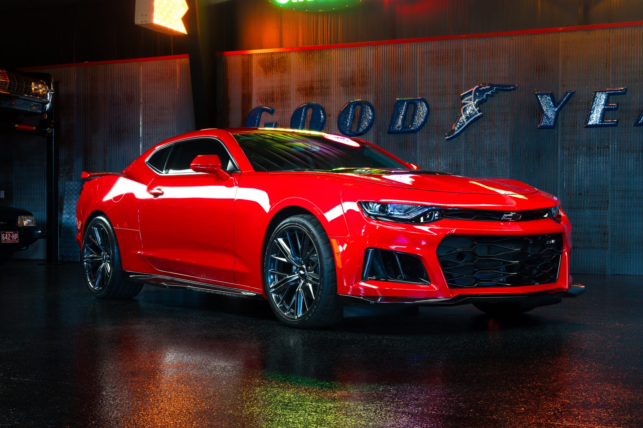 The 20″ split 10-spoke ZL1-style alloy wheels were fitted under current ownership and are mounted with Goodyear Eagle F1 Supercar 3 tires showing 2018 date codes. The car is equipped with a sport-tuned suspension and Stabilitrak traction control.