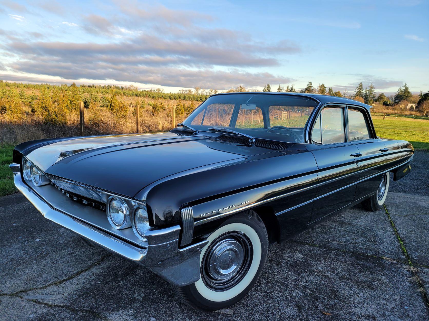 Painted 14″ steel wheels wear stainless steel hubcaps with color-keyed trim rings and are mounted with whitewall tires. Fifth-generation 88s were equipped with coil-spring suspension front and rear, and braking is handled by four-wheel drums.
