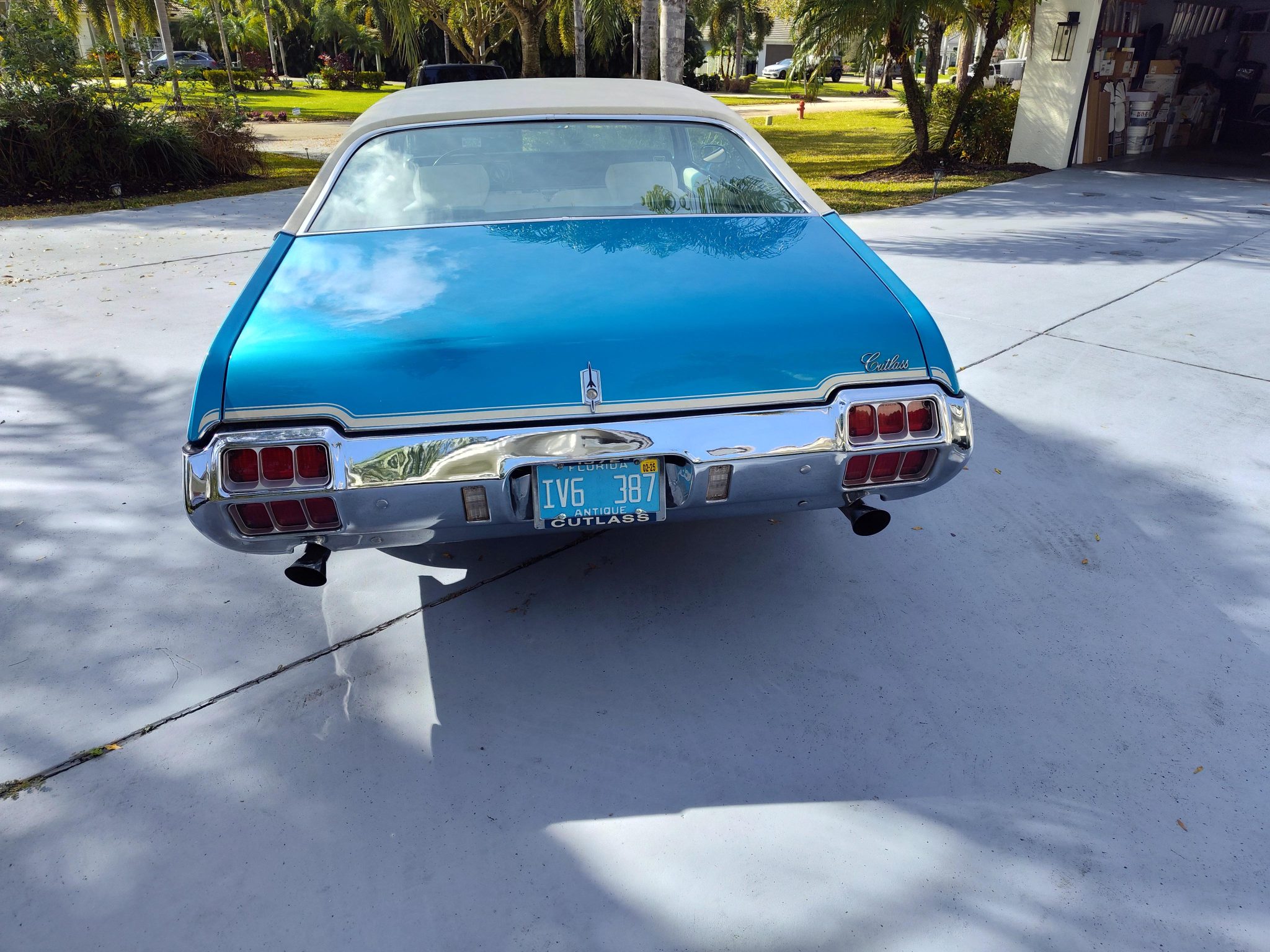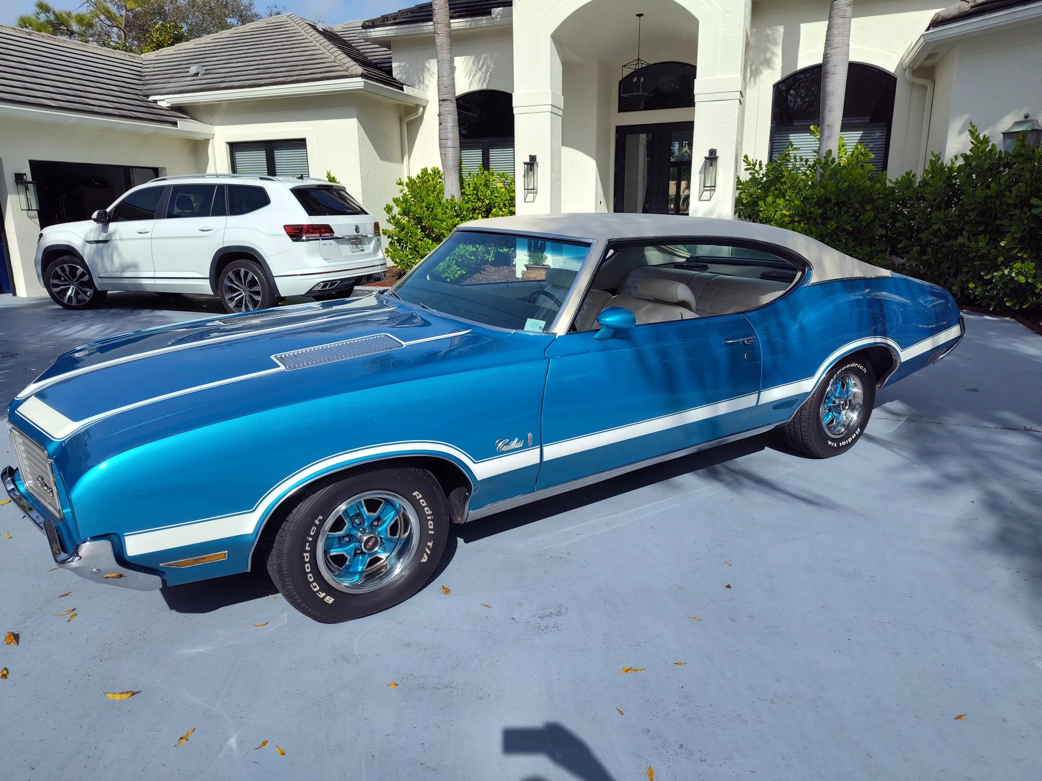 Blue-accented Super Stock III 14″ wheels are mounted with BFGoodrich Radial T/A tires measuring 225/70. The power-assisted braking system was converted to front discs under current ownership, according to the seller, and the brake master cylinder was replaced. The car is equipped with power steering.