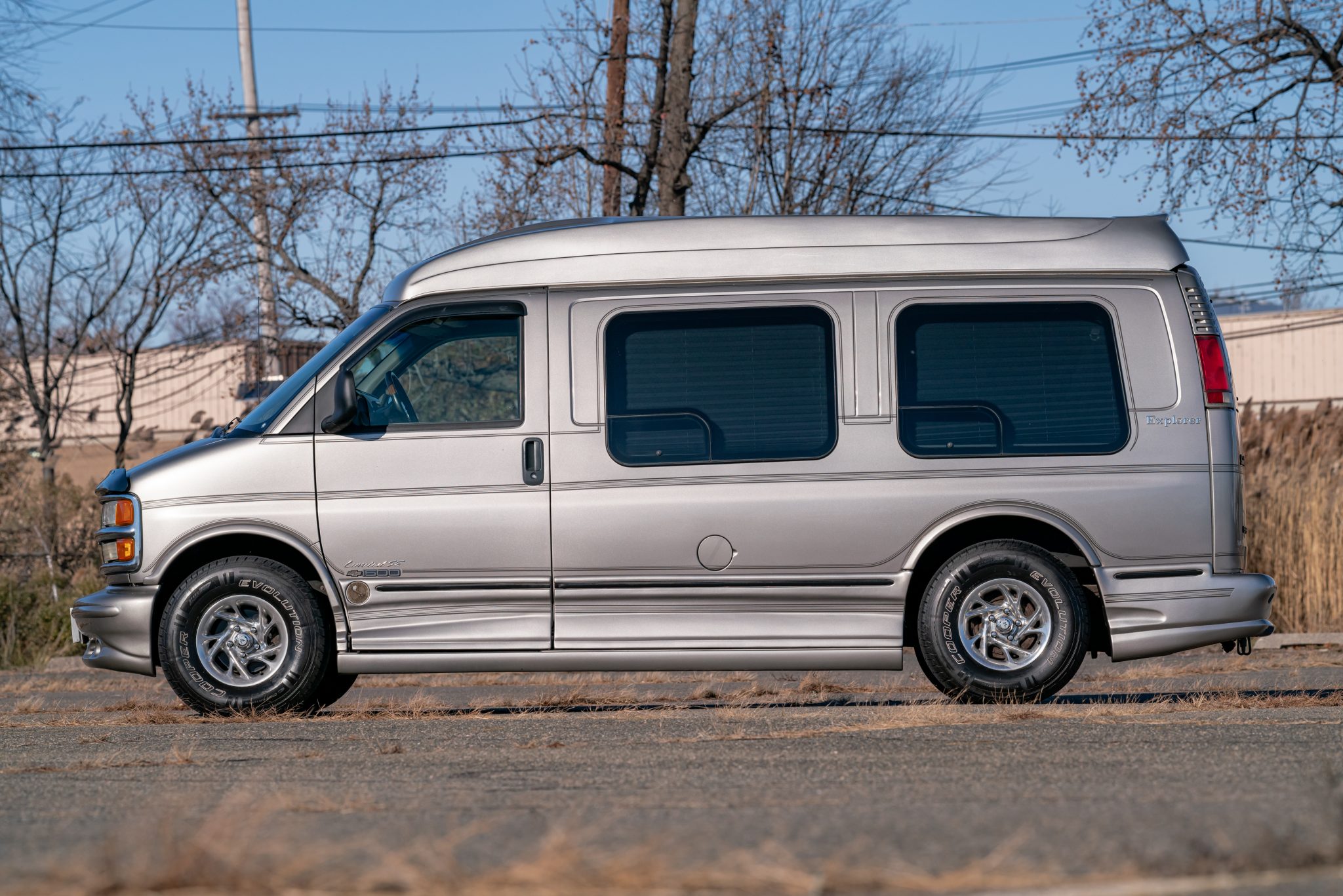 Polished 15″ American Racing wheels are mounted with 265/75 Cooper Evolution H/T white-letter tires. The van is equipped with power steering and power-assisted front disc and rear drum brakes.