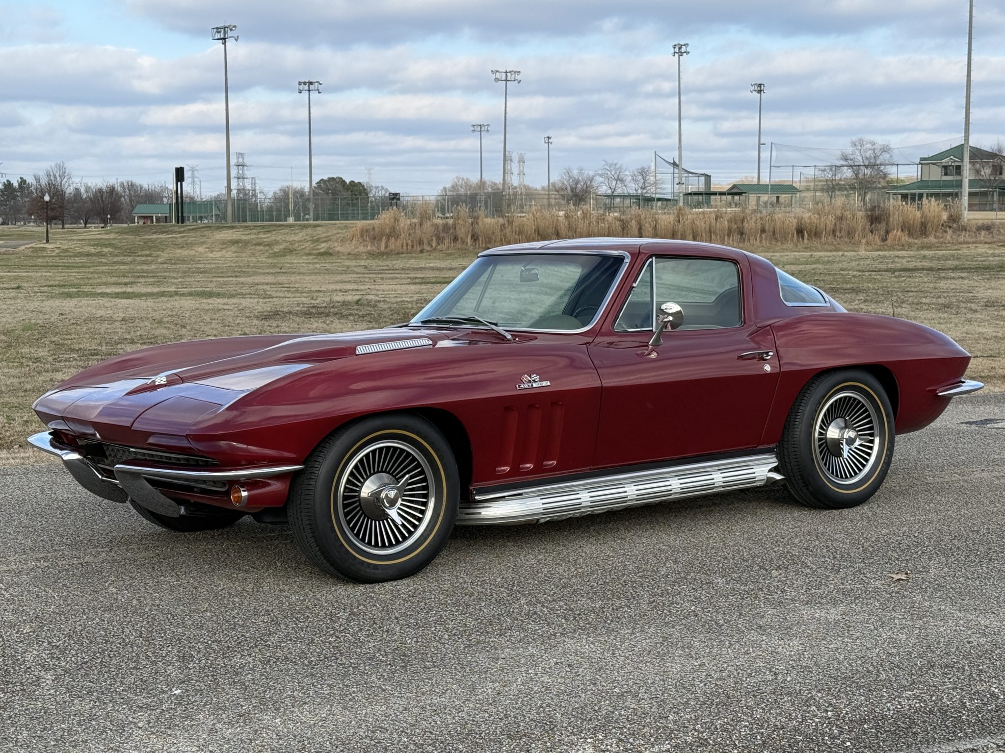 The 15″ Turbine-style aluminum wheels feature knock-off spinners and are mounted with Firestone tires measuring 215/70. The C2 was the first Corvette to offer fully independent suspension, with upper and lower control arms at the front and a three-link setup with a transverse leaf spring at the rear. The car is equipped with power steering, and braking is handled by four-wheel discs.