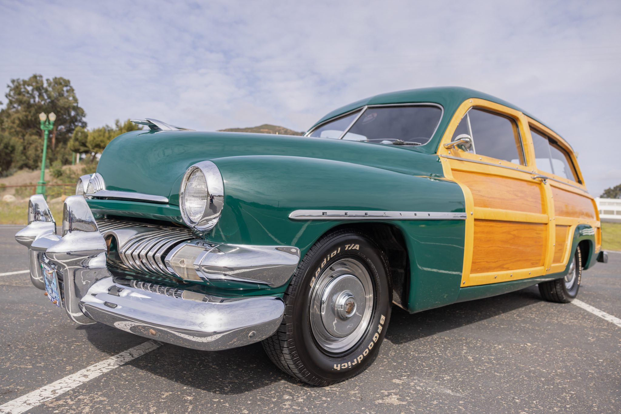 Black-painted 15″ steel wheels wear polished hubcaps and are wrapped in BFGoodrich Radial T/A tires. A spare wheel and tire are stored beneath a hard cover attached to the tailgate. A front disc brake conversion kit has been equipped.