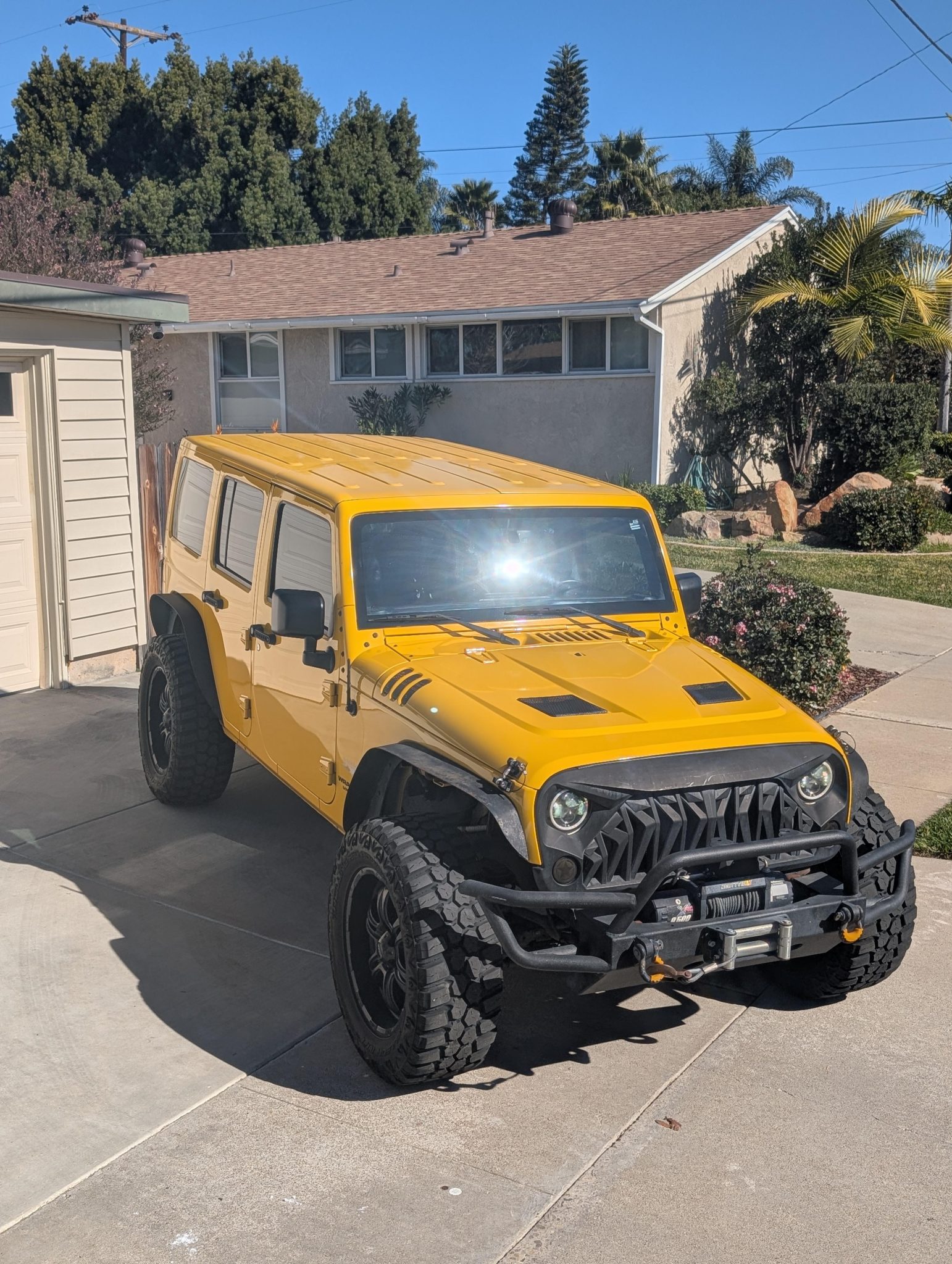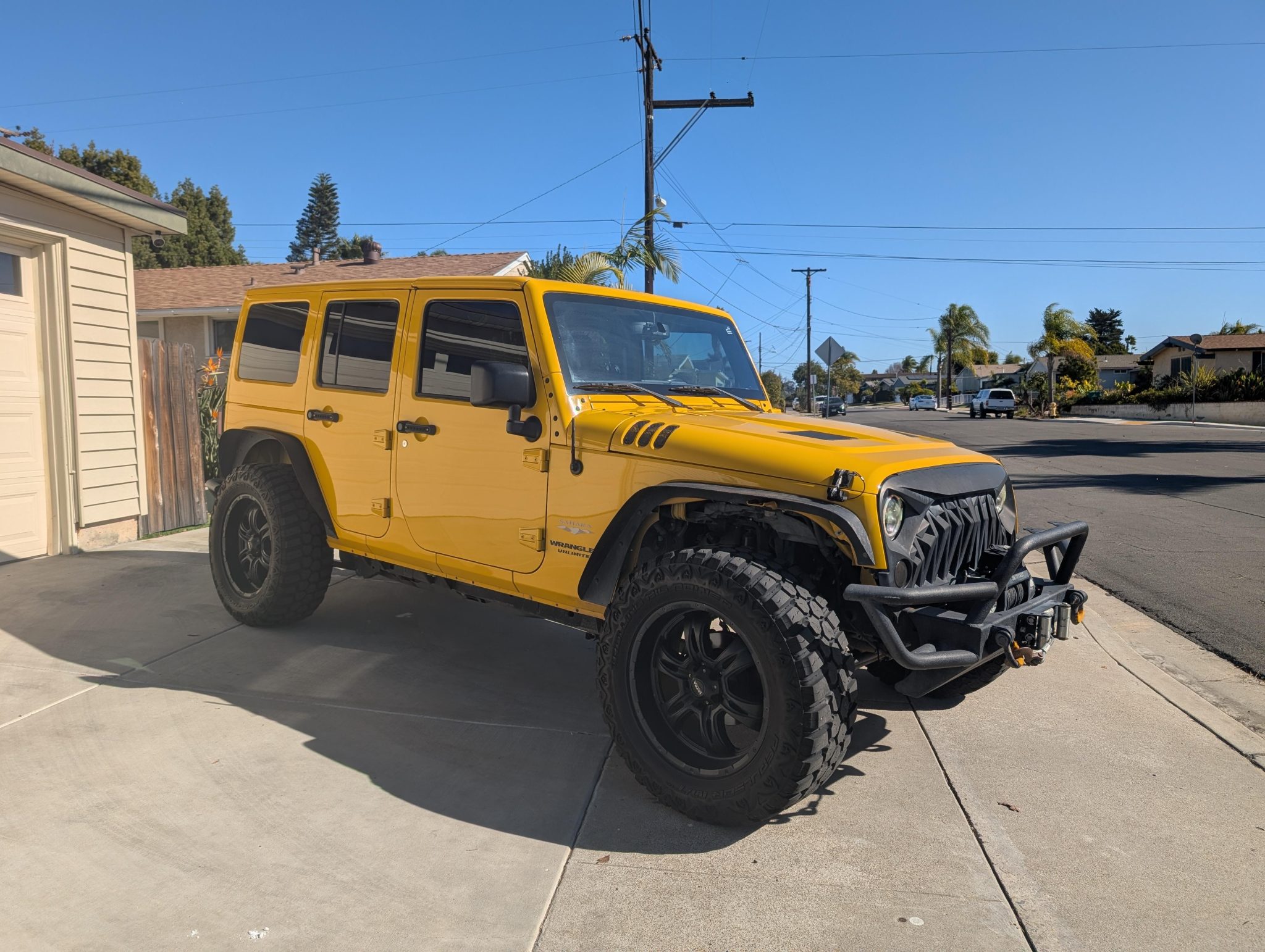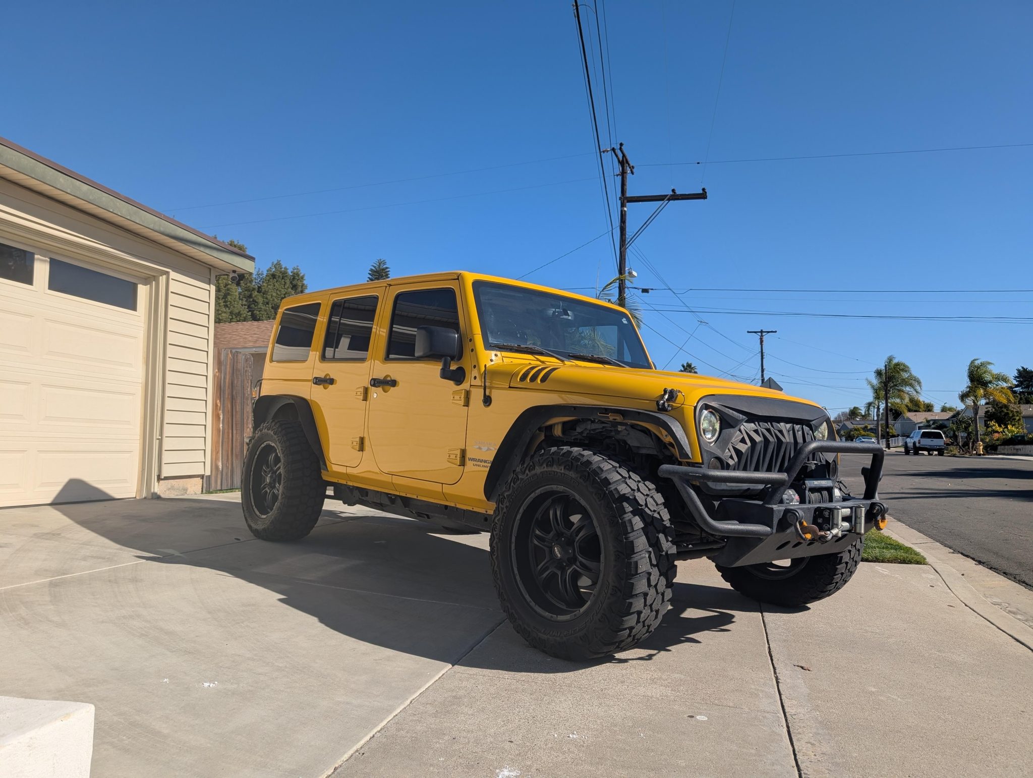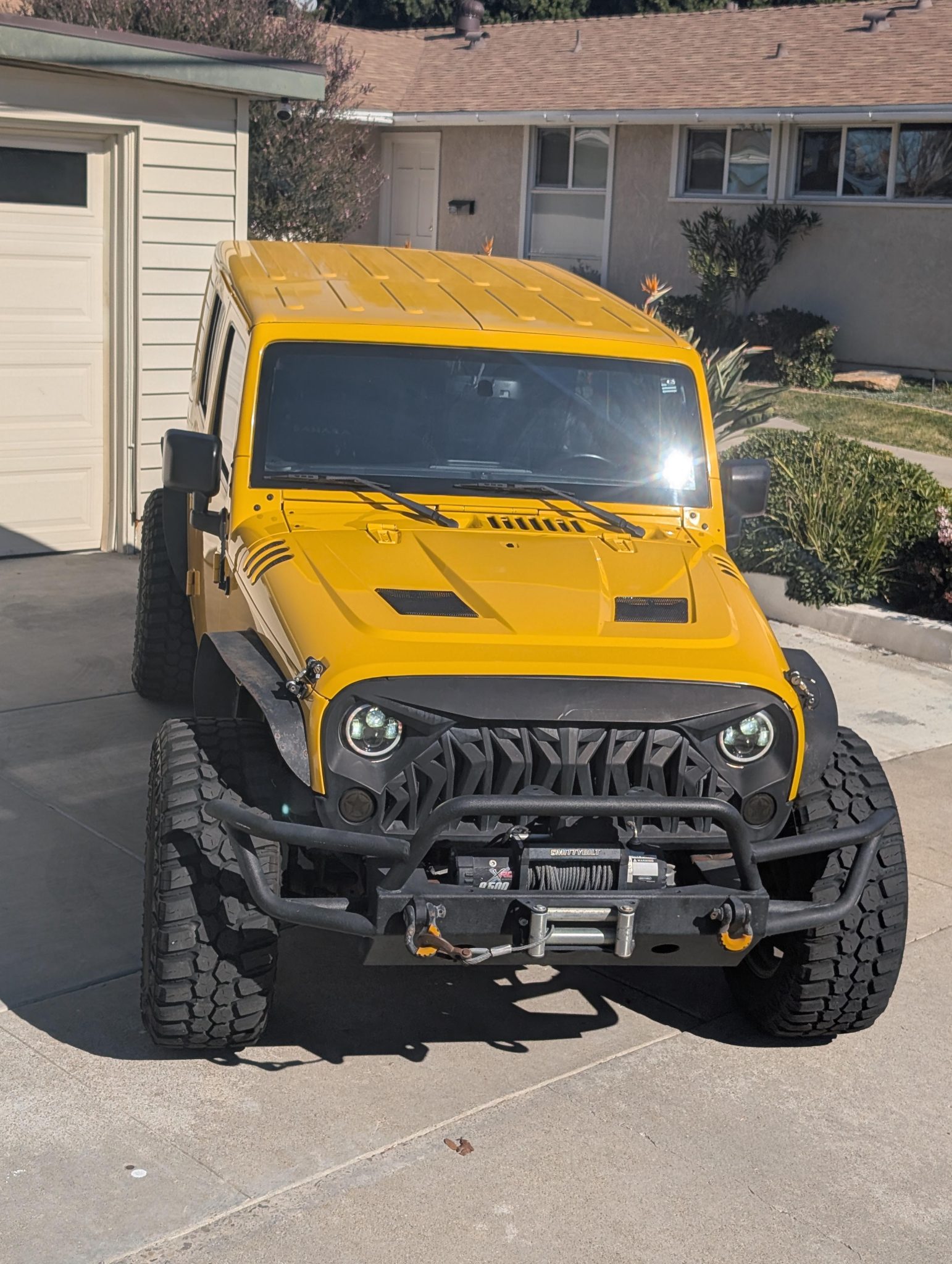 Black 20″ Ultra Motorsports wheels are mounted with 35×12.5″ Rolling Big Power Repulsor M/T tires, and a matching spare is affixed to the swing-out tailgate. A 2″ suspension lift has been fitted, and braking is handled by discs at each corner. The steering stabilizer, drag link, tie rods, ball joints, and shock absorbers were replaced in 2023.