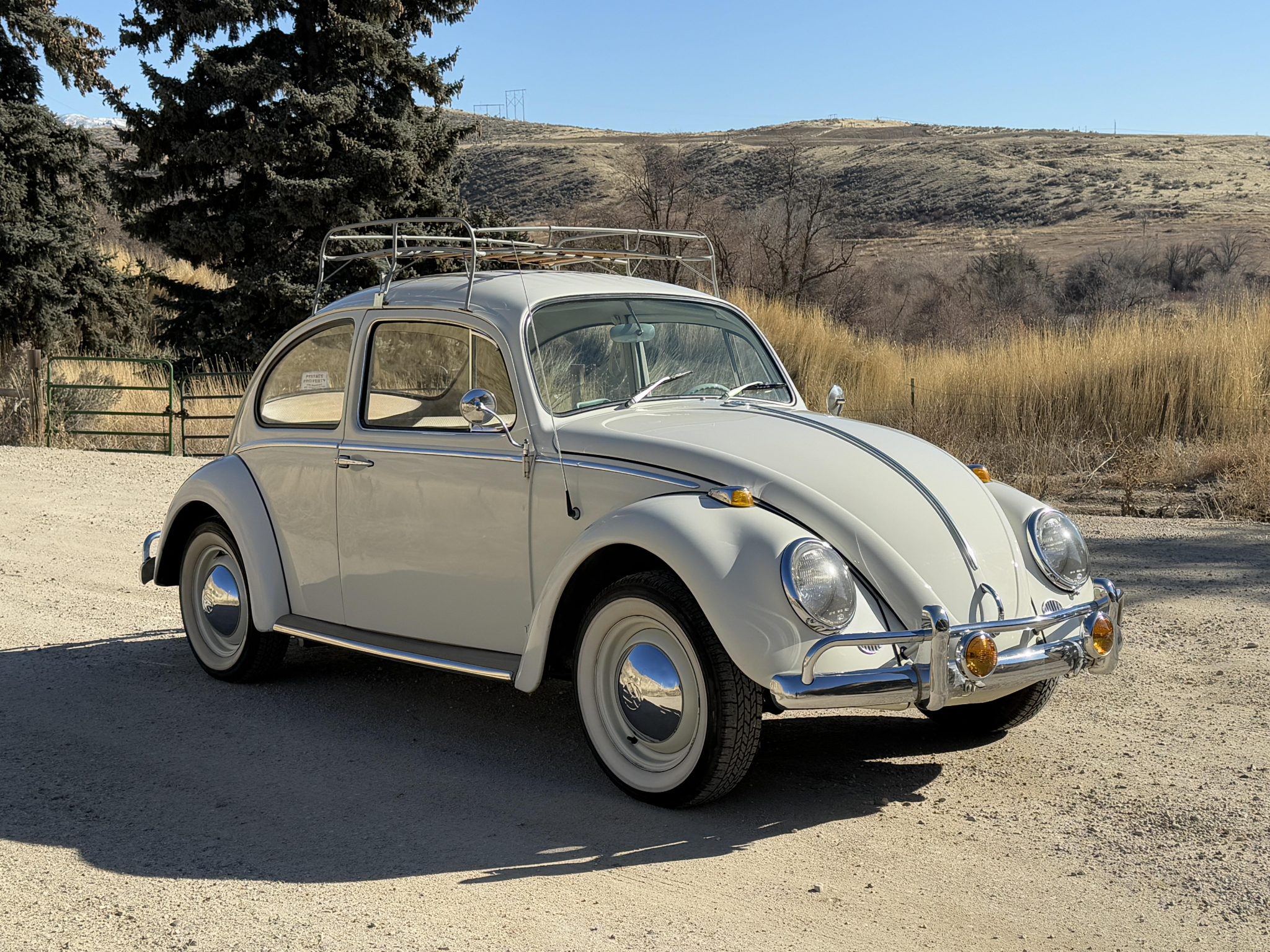 Body-color 15″ steel wheels wear VW-stamped hubcaps and are mounted with 165-series Coker Classic whitewall tires. Stopping power is provided by drum brakes at all four corners.