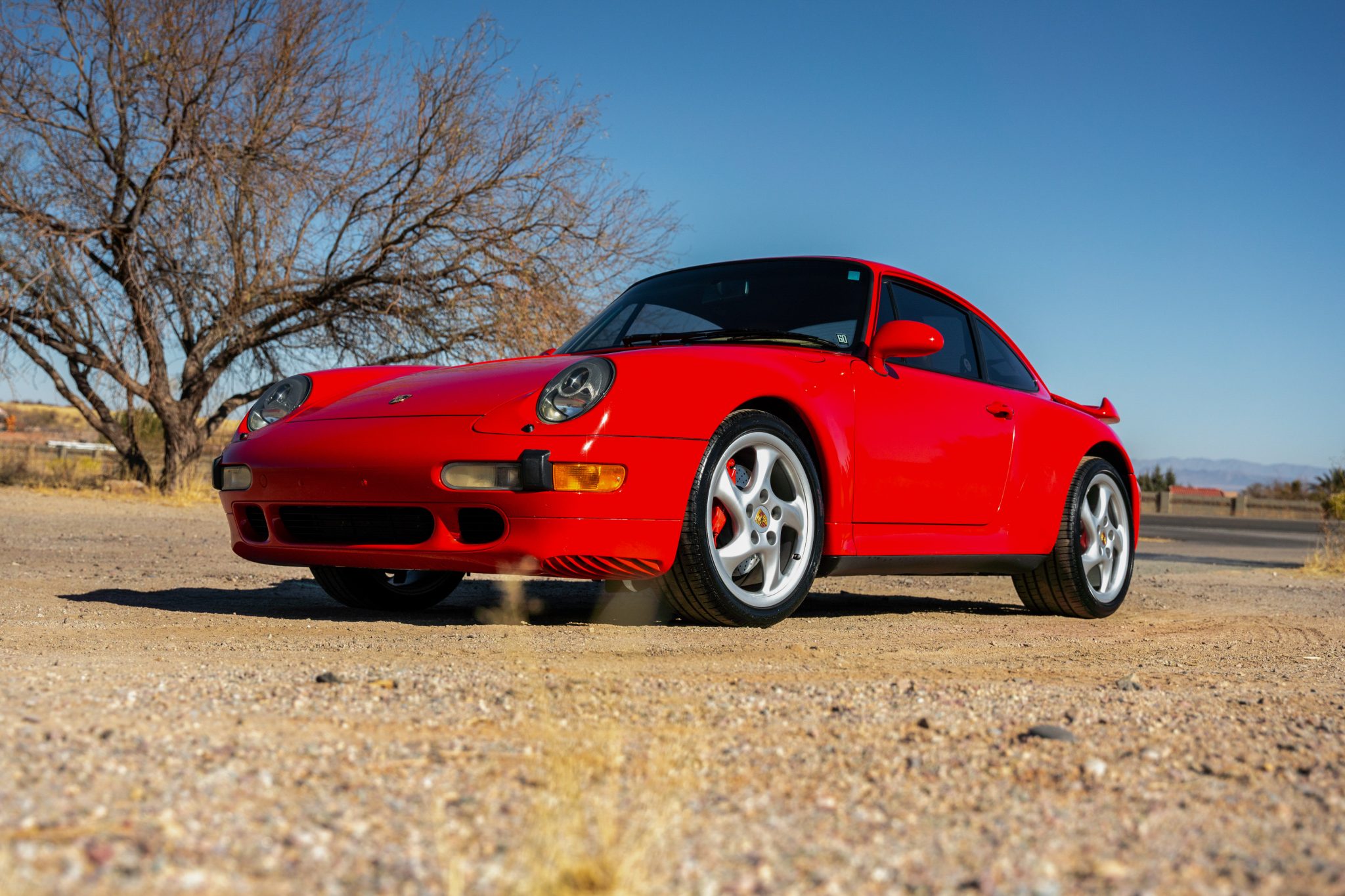 The 18″ Turbo wheels have hollow spokes. The car features an Automatic Brake Differential (ABD), and the 993 was the first 911 to feature multi-link rear suspension. Braking is provided by Porsche-branded four-piston calipers over cross-drilled rotors. The brake rotors, pads, and wear sensors were replaced in 2023.