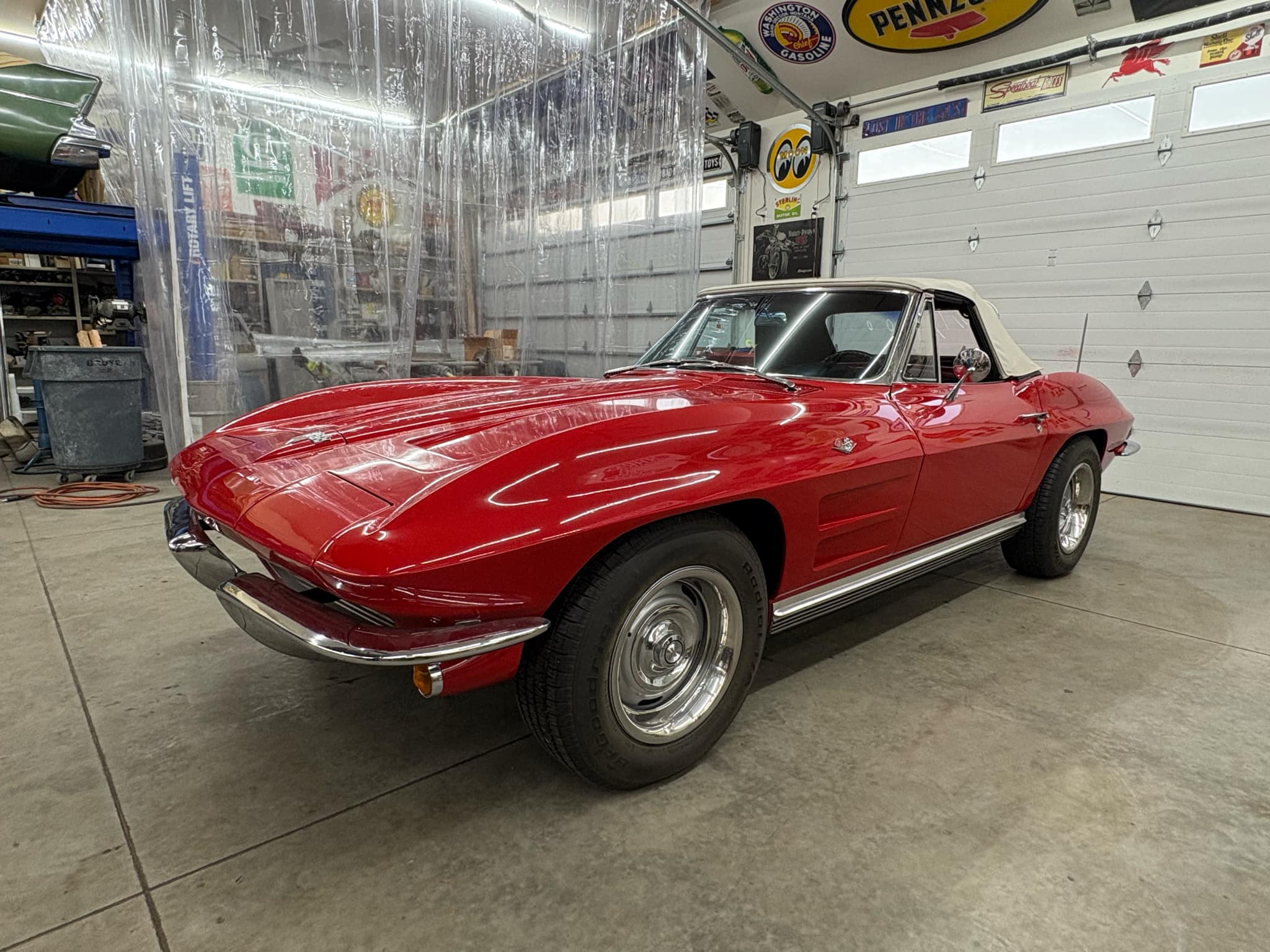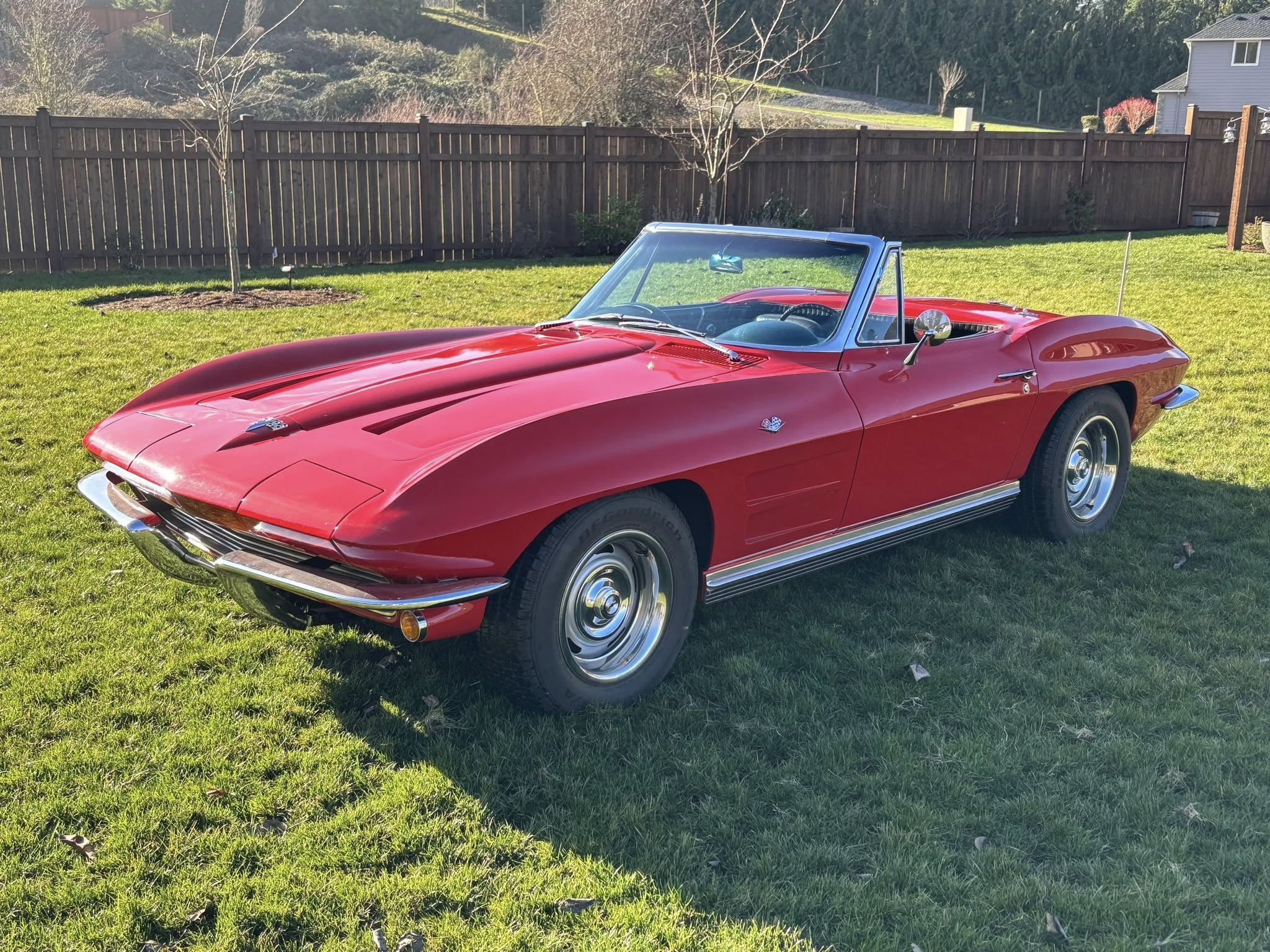 The 15” wheels are mounted with BFGoodrich tires, and this example was optioned with metallic brakes from the factory. The C2 was the first Corvette to offer fully independent suspension, with upper and lower control arms at the front and a three-link setup with a transverse leaf spring at the rear.