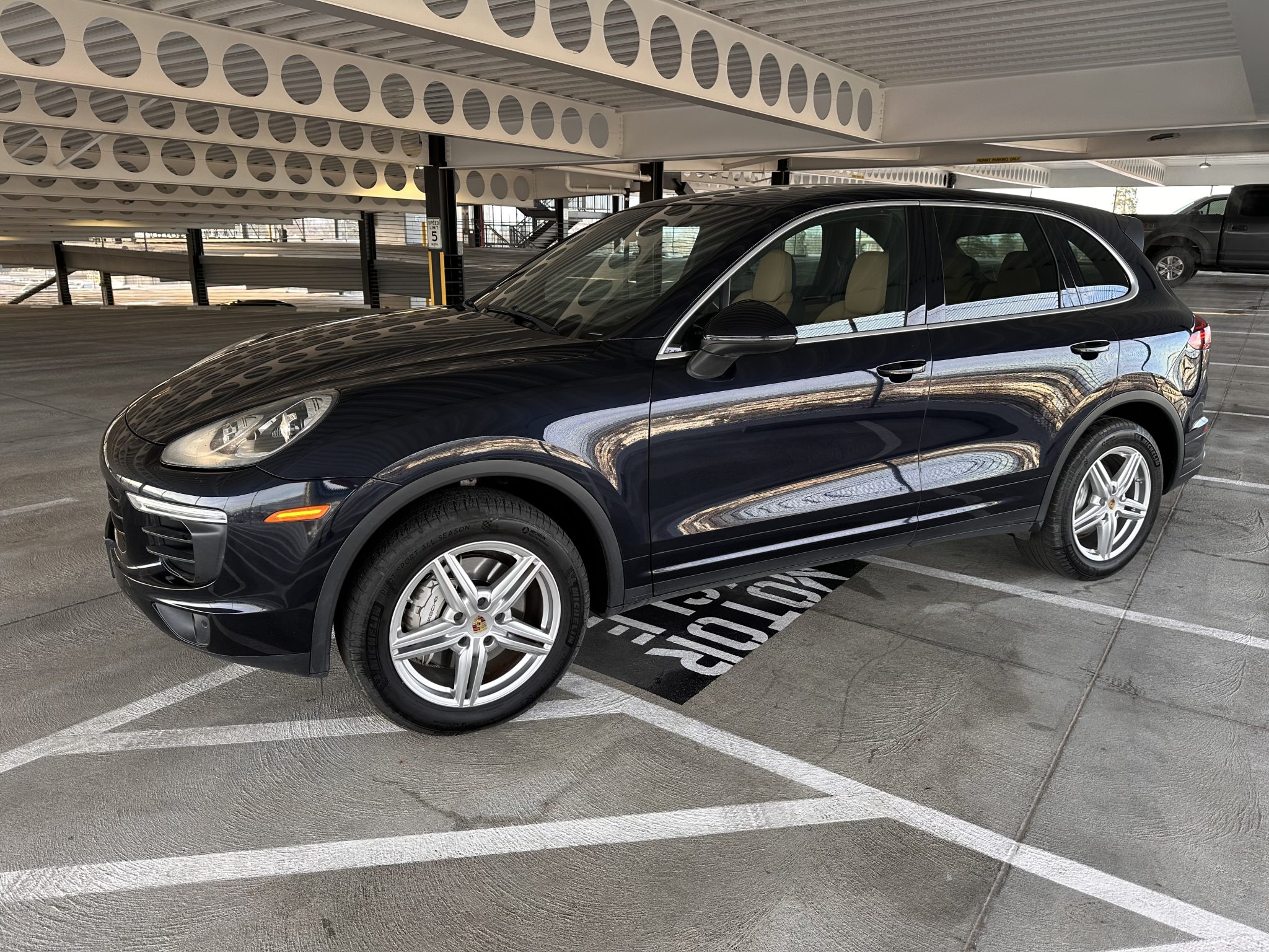 The 19″ Cayenne Design II alloy wheels are mounted with 265/50 Michelin Pilot Sport All Season 4 tires. Stopping power is provided by six-piston front and four-piston rear brake calipers over ventilated rotors at each corner. The brake pads were replaced in March 2023.