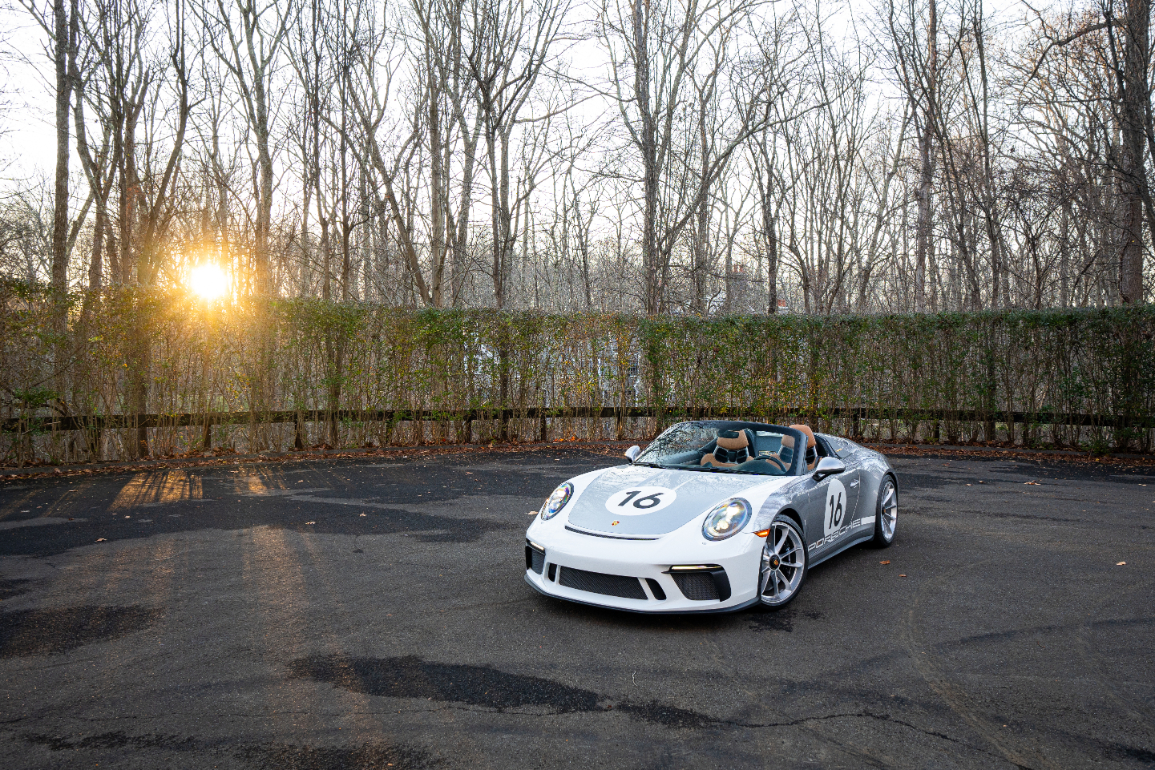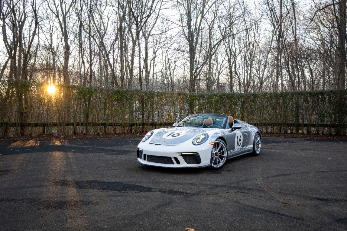 Center-locking 20″ forged alloy wheels are mounted with Michelin Pilot Sport Cup 2 tires that were installed in preparation for the sale. Porsche Active Suspension Management (PASM), Porsche Stability Management (PSM), and rear-axle steering were standard on the Speedster, and this example was optioned with a front-axle lift system. Braking is handled by four-wheel cross-drilled Porsche Ceramic Composite Brakes with Porsche-branded calipers. A brake line was replaced in April 2022, and a brake fluid flush was performed in January 2025.