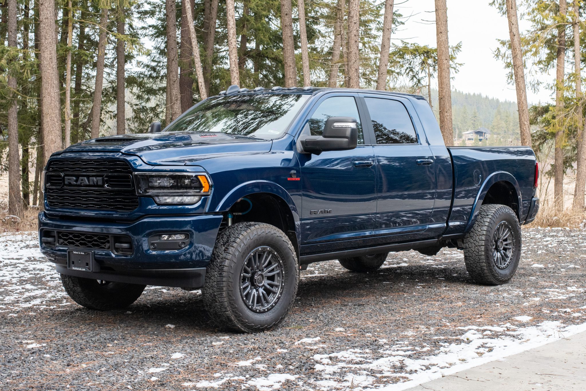 Gunmetal-finished 20″ Fuel wheels with black simulated beadlock rings are wrapped in 37×12.50″ Falken Wildpeak A/T tires. The suspension is modified with a Carli Pintop leveling kit and front sway bar and features a factory auto-leveling rear air suspension. Antilock braking is handled by four-wheel discs.