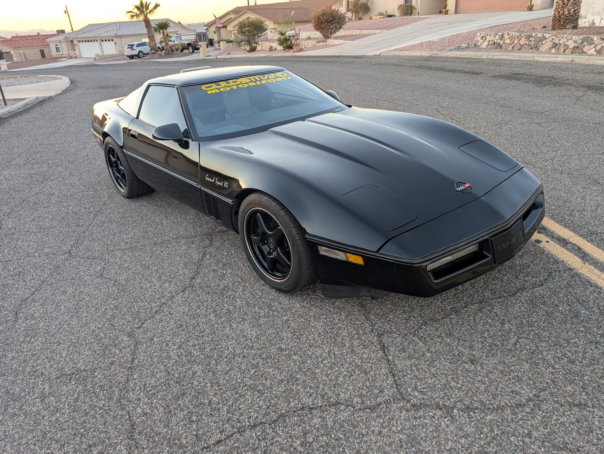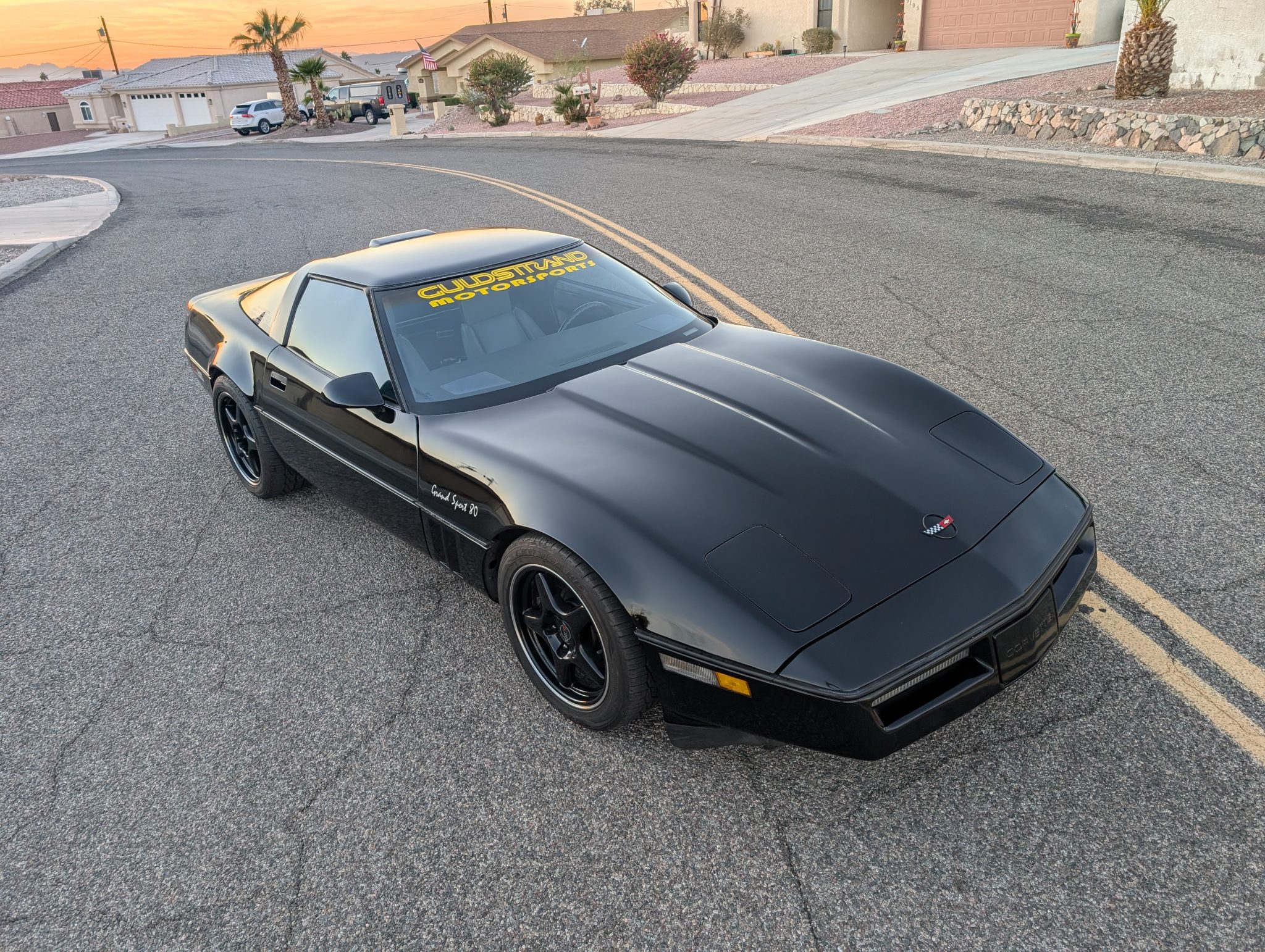The car is finished in black and features Guldstrand Motorsports and Grand Sport 80 graphics as well as pop-up headlights, fog lamps, a removable painted roof panel, and quad exhaust outlets. Paint chips and scratches are noted.