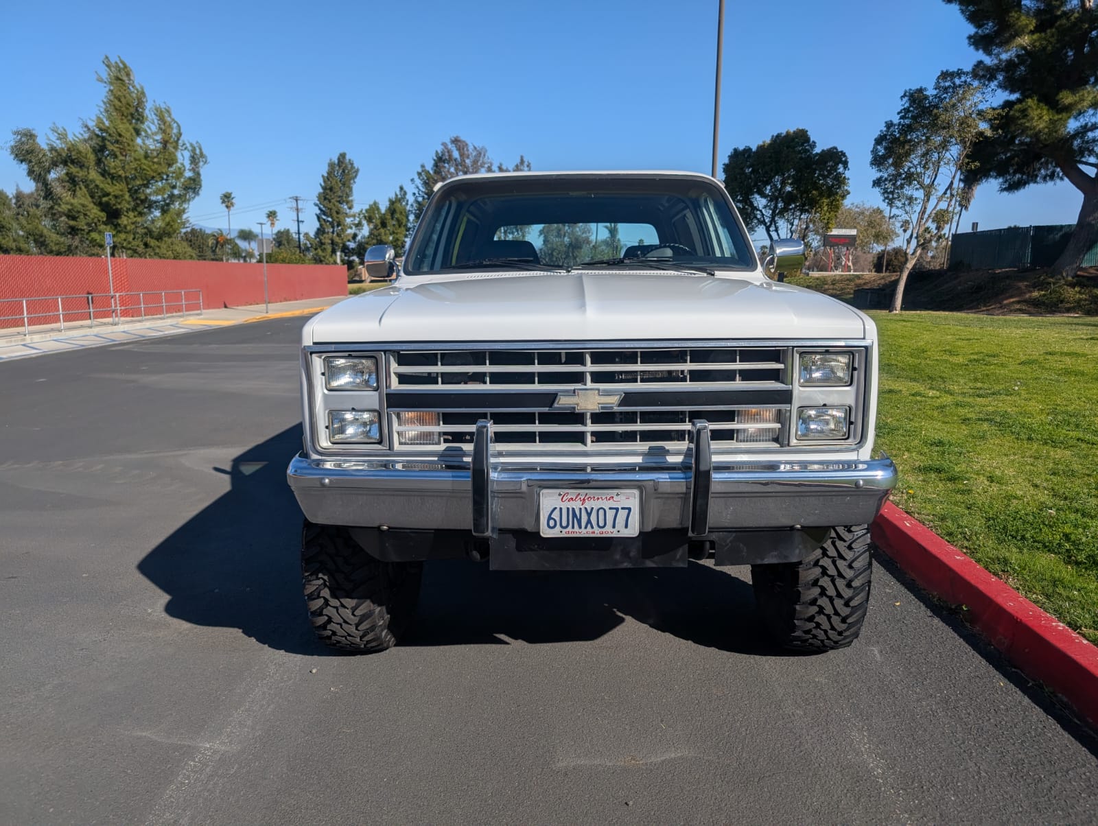 Black 16″ steel wheels are mounted with 315/75 Toyo Open Country M/T tires. The truck is equipped with manually locking front hubs and a Rough Country 4″ suspension lift. Braking is handled by front discs and rear drums.