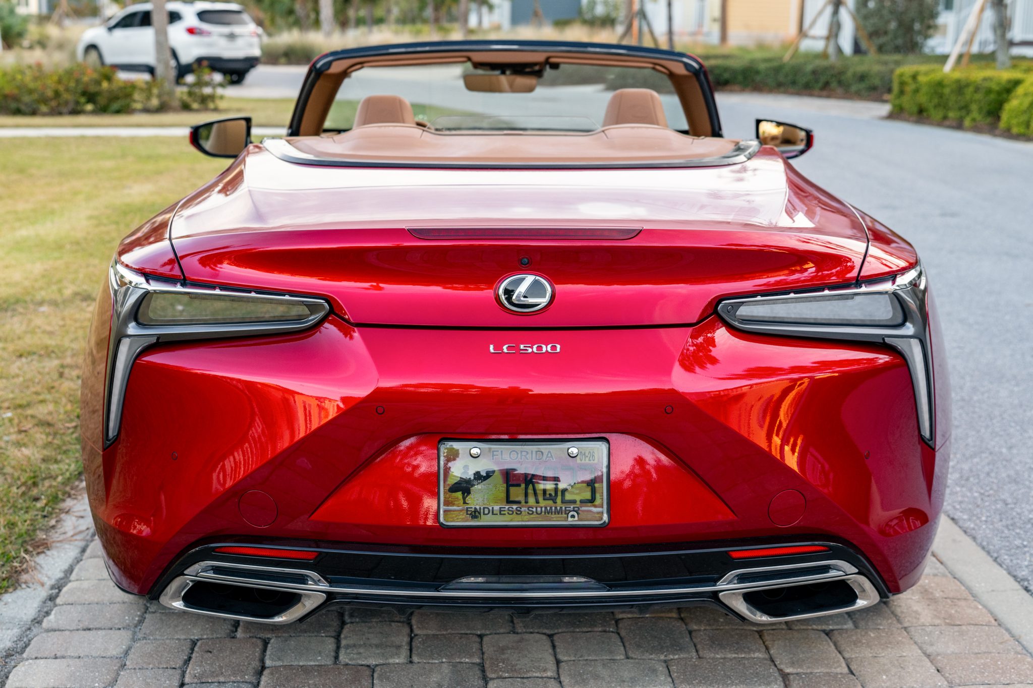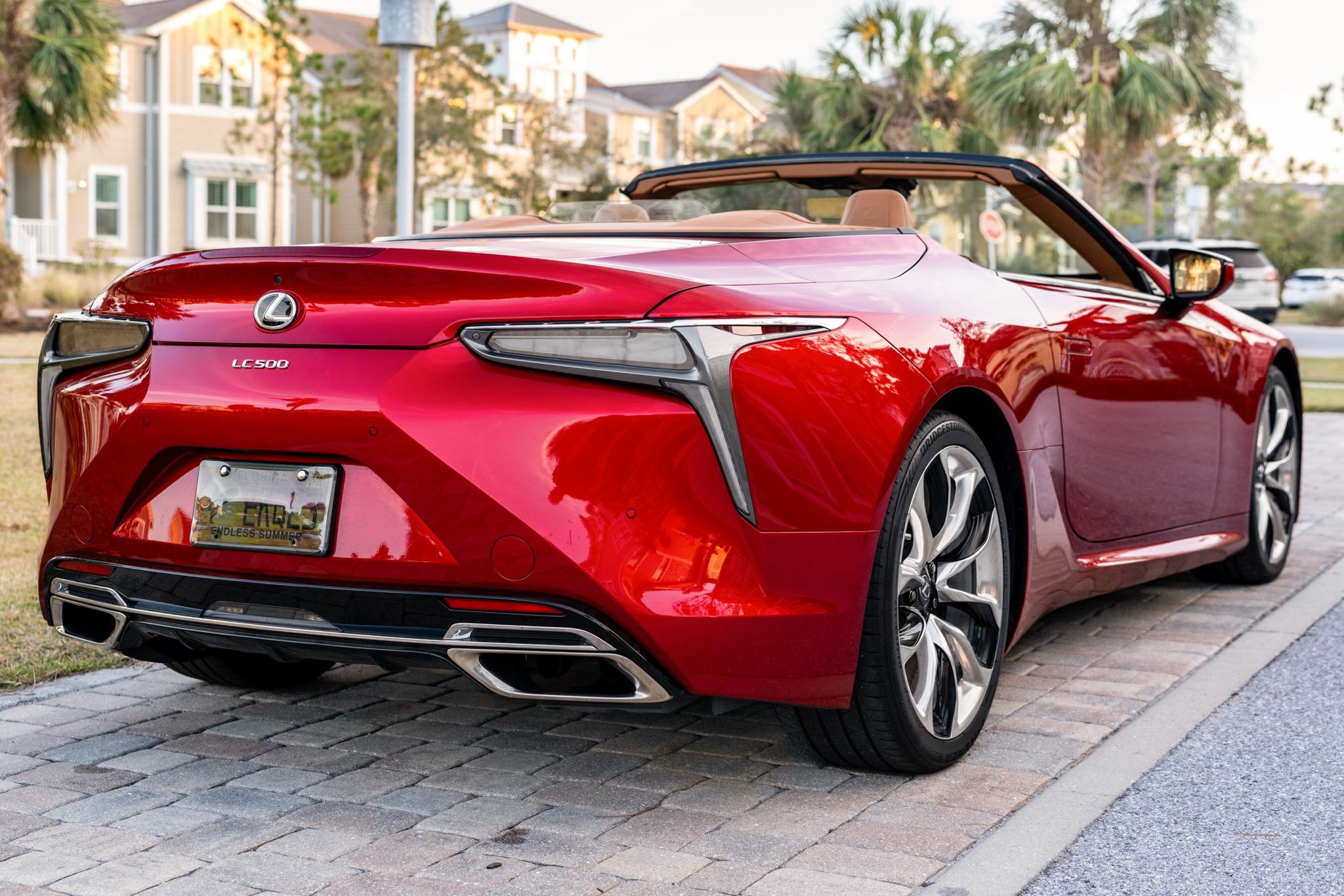 Polished and black-accented 21″ alloy wheels are mounted with Bridgestone Potenza S001L tires. The car is equipped with an Adaptive Variable Suspension, and stopping power is provided by Lexus-branded calipers over ventilated disc brakes at all four corners.
