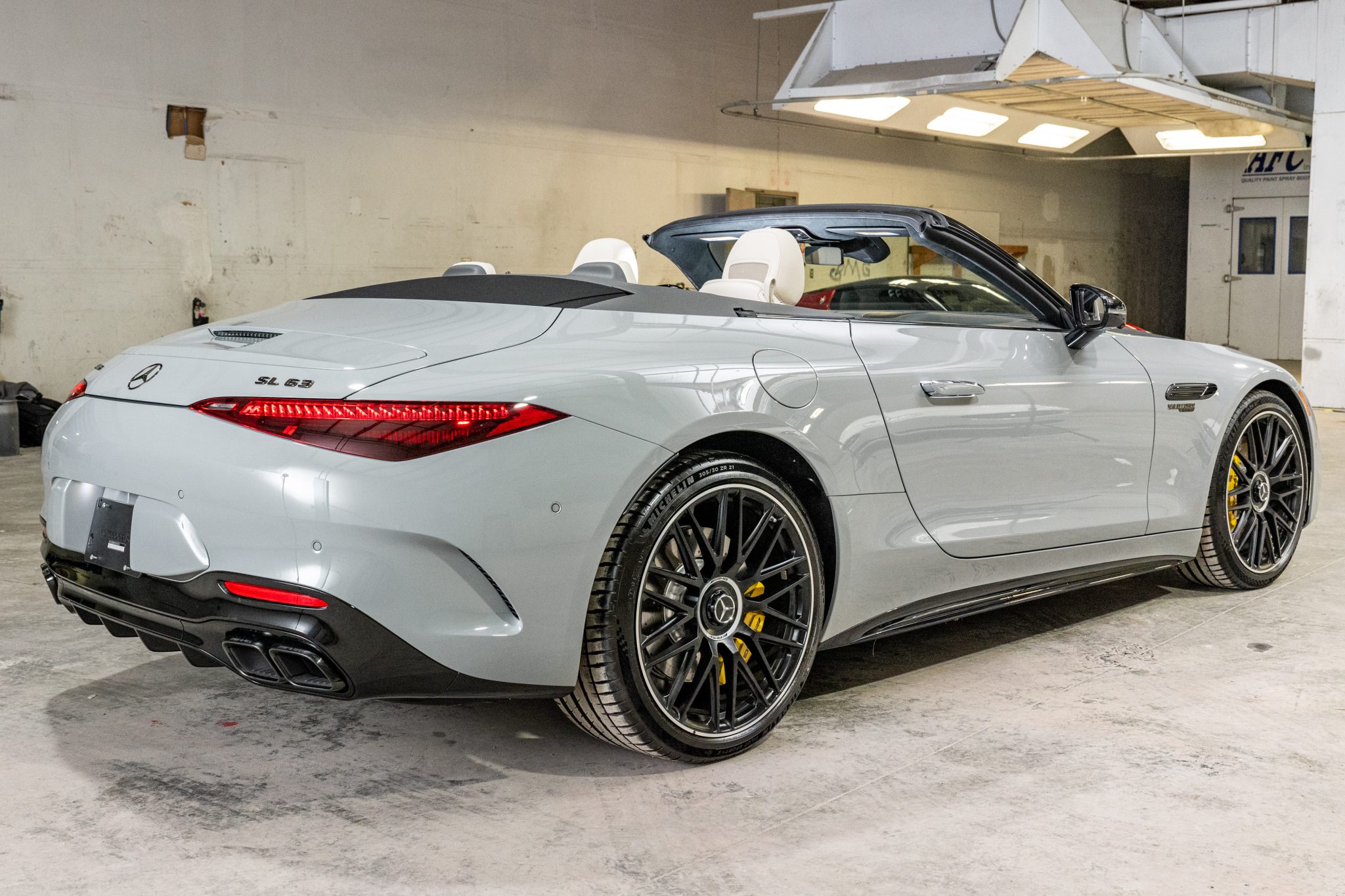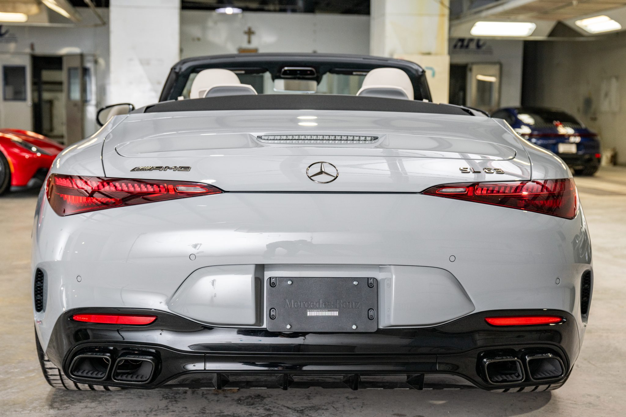 The 21″ AMG forged cross-spoke wheels are wrapped in 275/35 front and 305/30 rear Michelin Pilot Sport 4 S tires. The car is equipped with rear-axle steering, a front-axle lift, and an AMG Active Ride Control suspension. Braking is handled by yellow AMG-branded calipers over cross-drilled rotors.