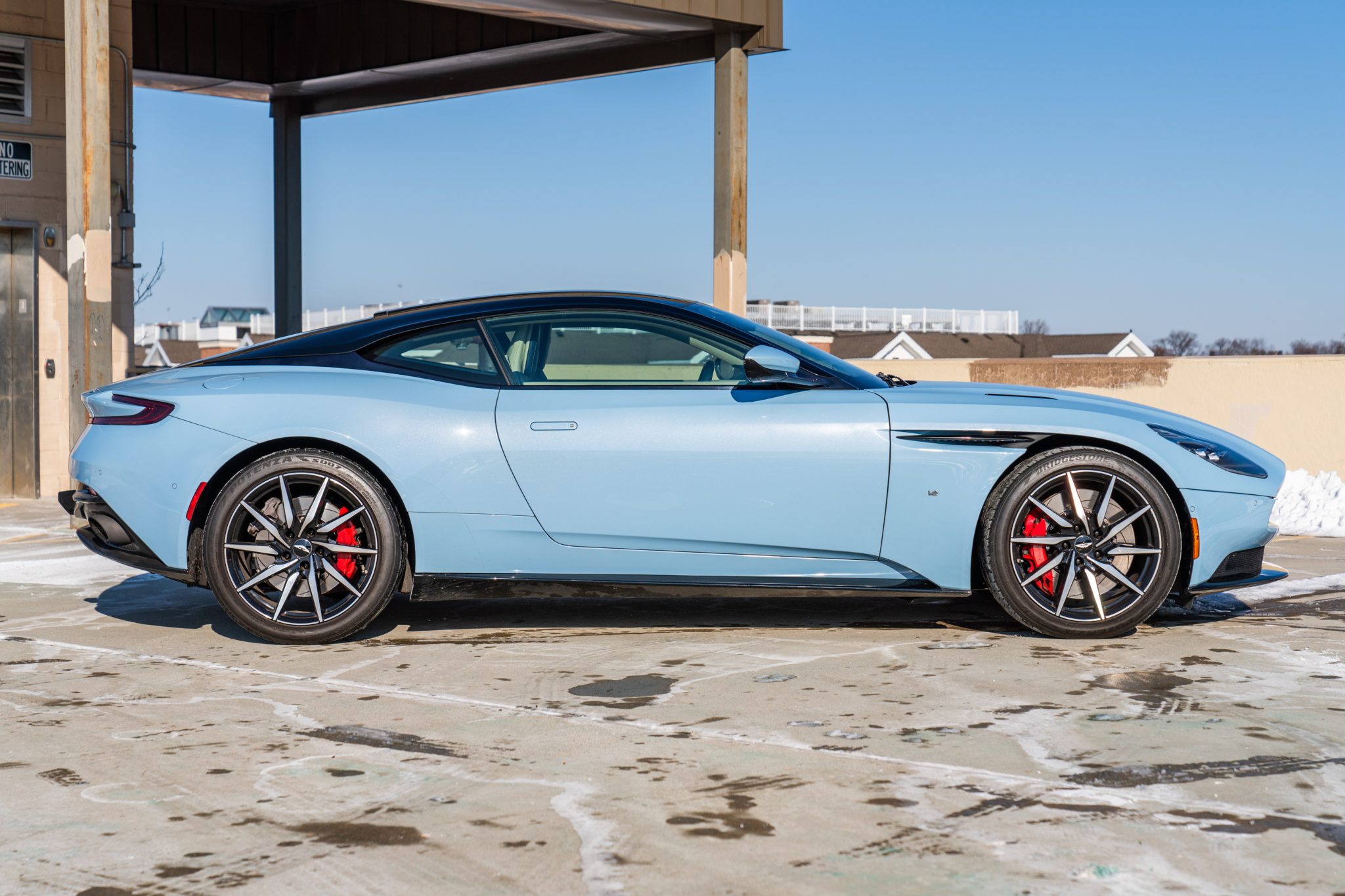 Directional 20″ 10-spoke wheels are finished in gloss black with diamond-turned accents and are mounted with 255/40 front and 295/35 rear Bridgestone Potenza S007 tires. The car came equipped from the factory with an Adaptive Damping System, and braking is handled by red calipers over slotted and ventilated discs at each corner. A brake fluid flush was performed in April 2024.