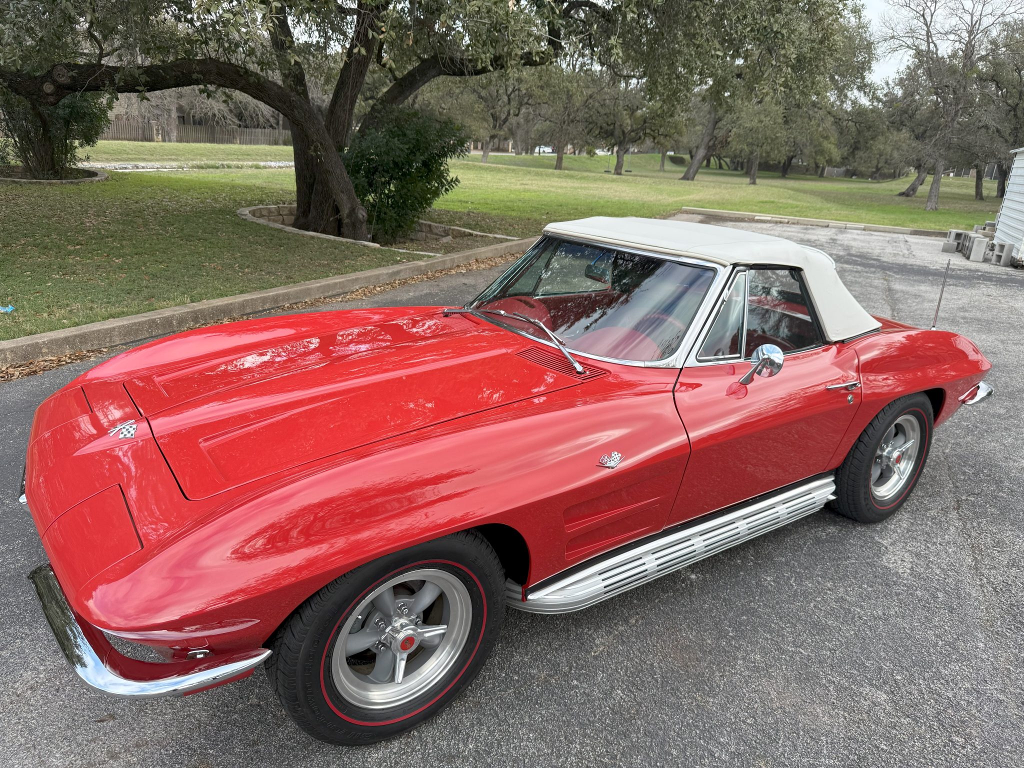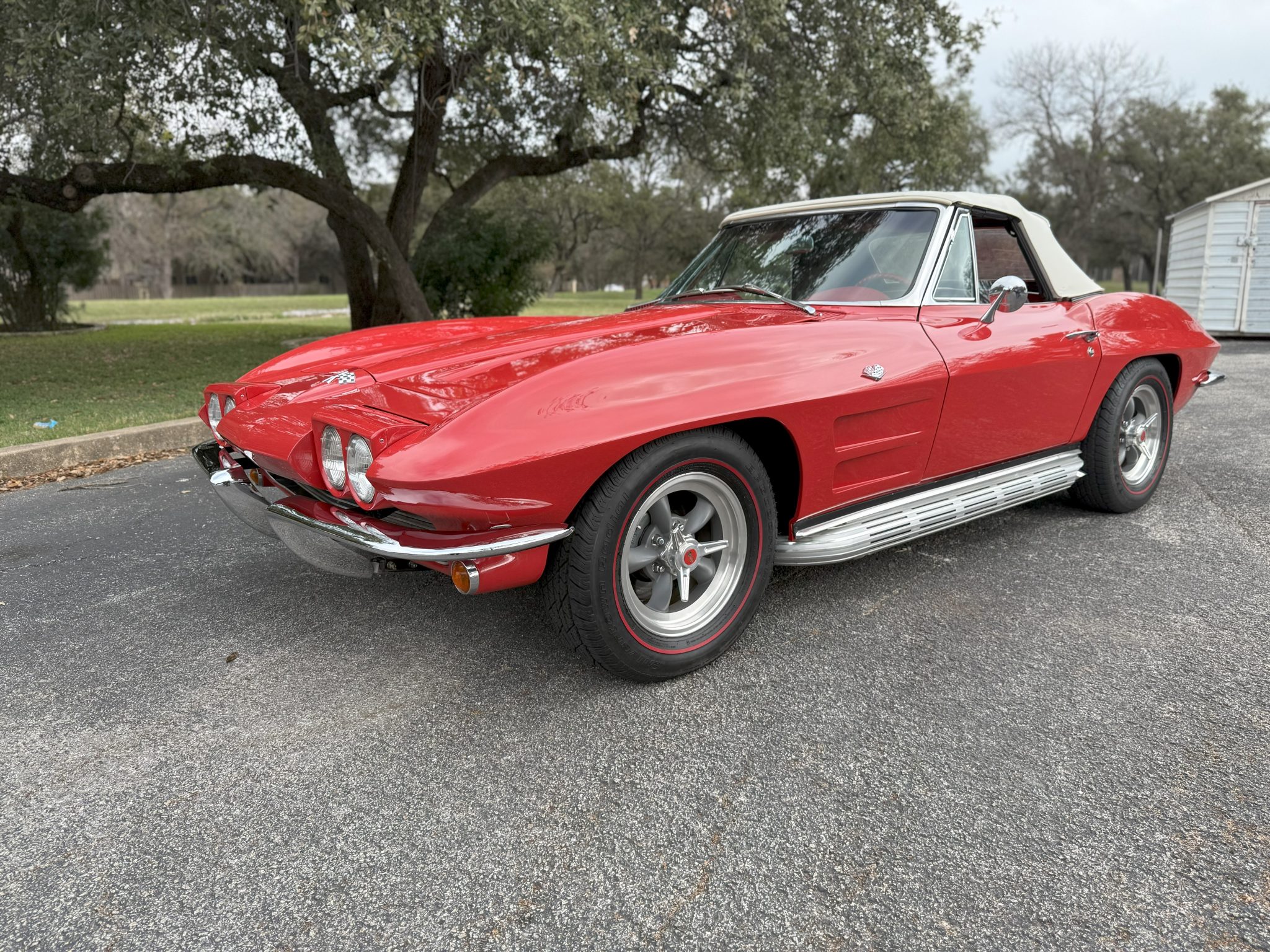 American Racing 15″ Torq Thrust Wheels were mounted with 215/70 BFGoodrich Silvertown Radial tires in 2008. The C2 was the first Corvette to offer fully independent suspension, with upper and lower control arms at the front and a three-link setup with a transverse leaf spring at the rear. Power steering and four-wheel disc brakes were added during the refurbishment. The front calipers were replaced in March 2024.