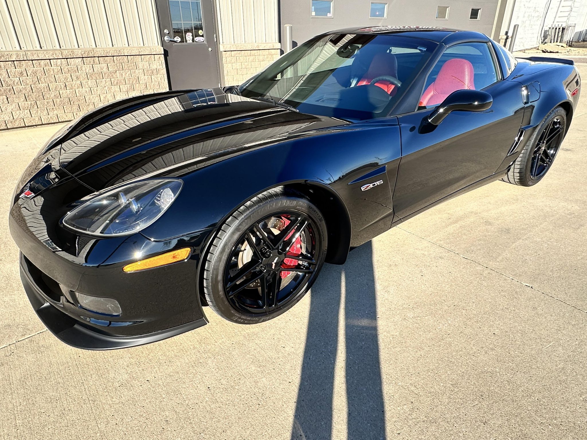 Staggered-diameter 18″ and 19″ multi-spoke wheels have been powder-coated black and are mounted with Michelin Pilot Sport 4S tires measuring 275/35 up front and 325/30 out back. Braking is handled by red-finished Corvette-branded calipers over cross-drilled and ventilated discs at each corner.