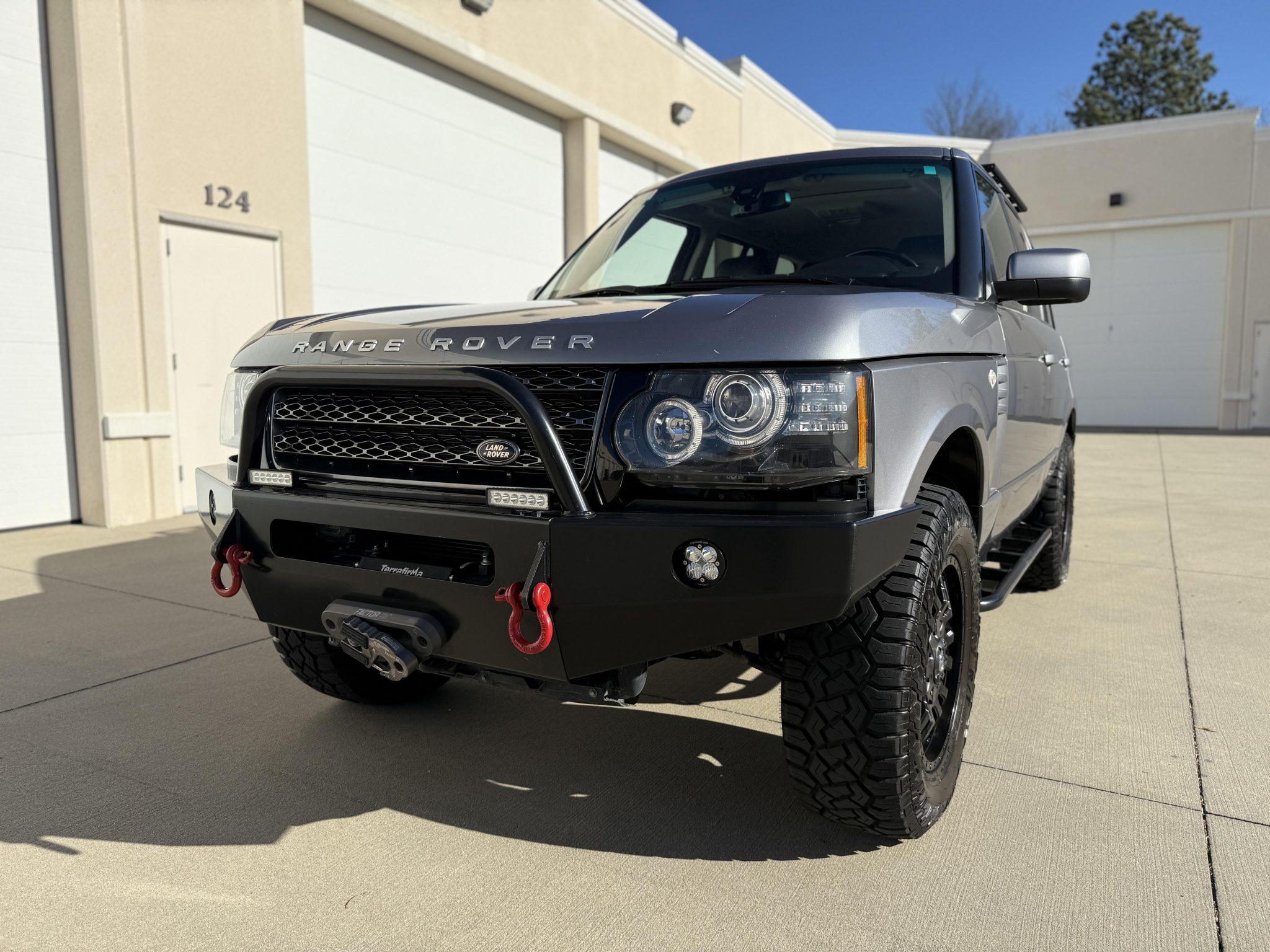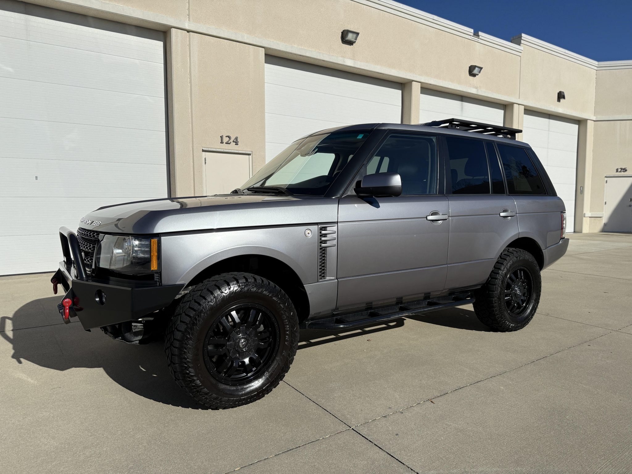 The 18″ Fuel wheels are mounted with 285/65 Prinx Hi Country R/T tires. The truck is equipped with an adjustable air suspension, a Terrain Response system, and Hill Descent Control. Braking is handled by four-wheel ventilated discs. Proud Rhino 2.5″ lift rods are installed. The suspension compressor was replaced in March 2022, the right front strut assembly was replaced in January 2023, the left rear brake caliper assembly and right rear brake sensor were replaced in August 2024, and in January 2025 the right front height sensor and front brake pad sensors were replaced.
