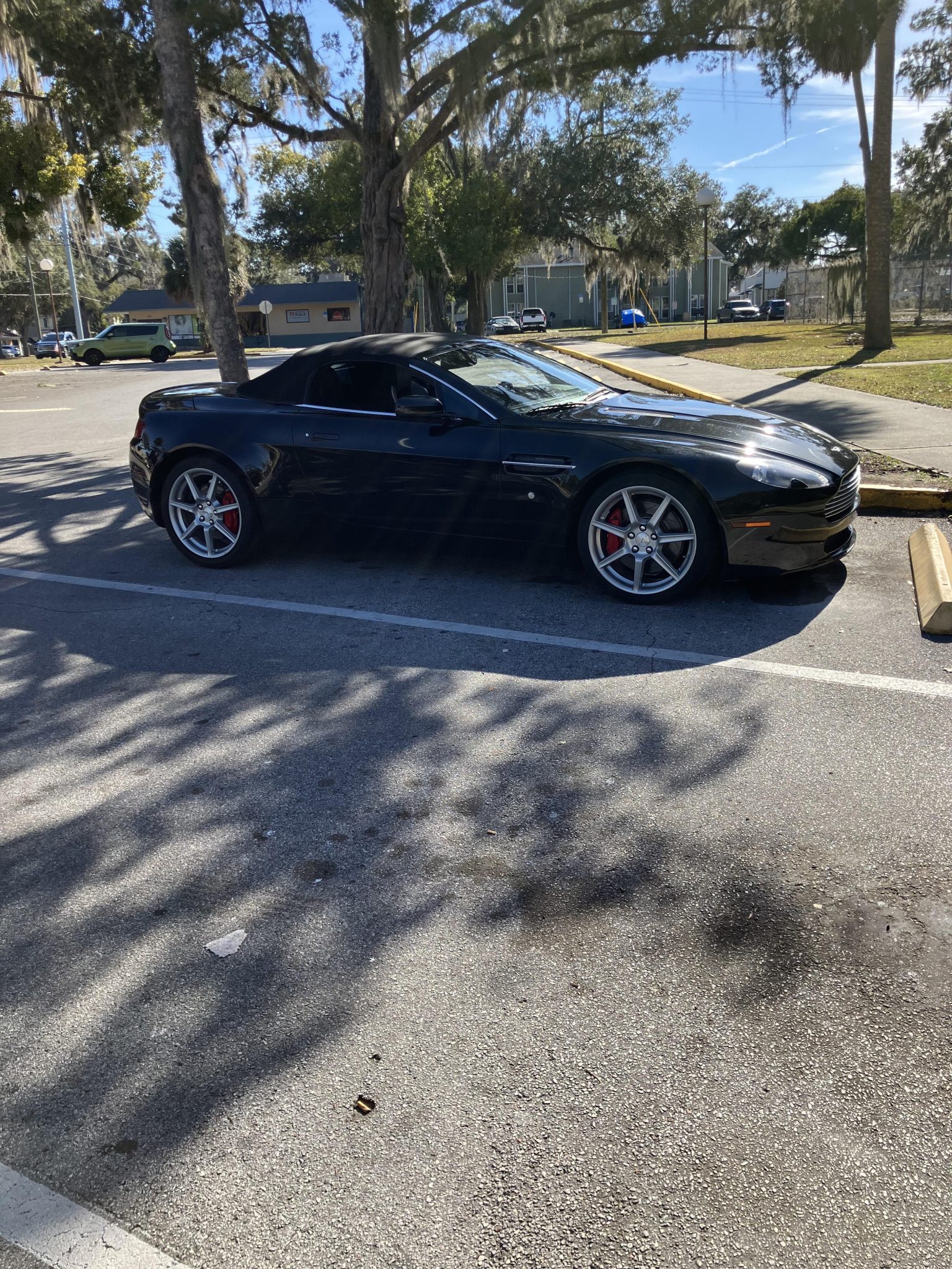 The 19″ seven-spoke alloy wheels are mounted with Bridgestone Potenza tires measuring 235/40 up front and 275/35 out back. Braking is from Aston Martin-branded red calipers over slotted rotors at all four corners.