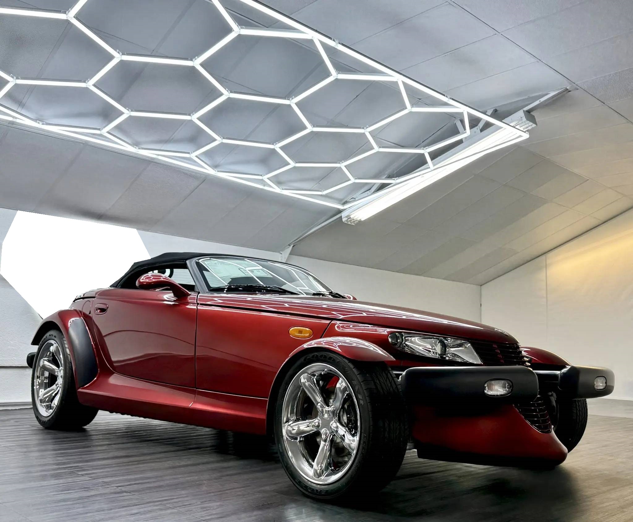 Chrome-finished 17″and 20″ chrome wheels are mounted with Goodyear Eagle GS-D tires measuring 225/45 up front and 295/40 out back. The suspension utilizes coilovers mounted inboard of the narrow front bodywork, and braking is from four-wheel ventilated discs.