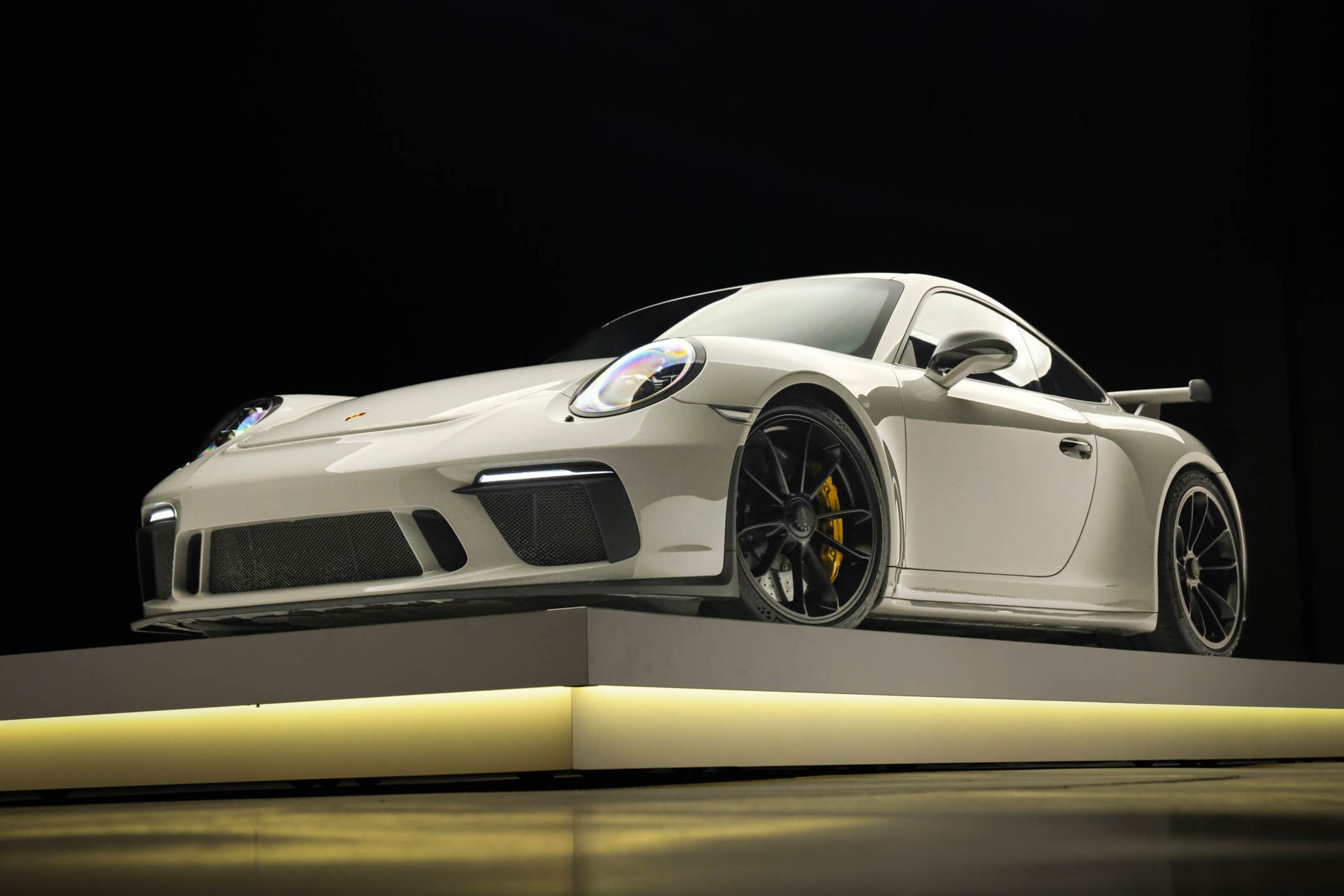 Satin black 20″ center-lock alloy wheels are mounted with Michelin Pilot Sport Cup 2 tires. Braking is handled by yellow Porsche-branded calipers over ceramic-composite rotors. The car is equipped with a front-axle lift system.