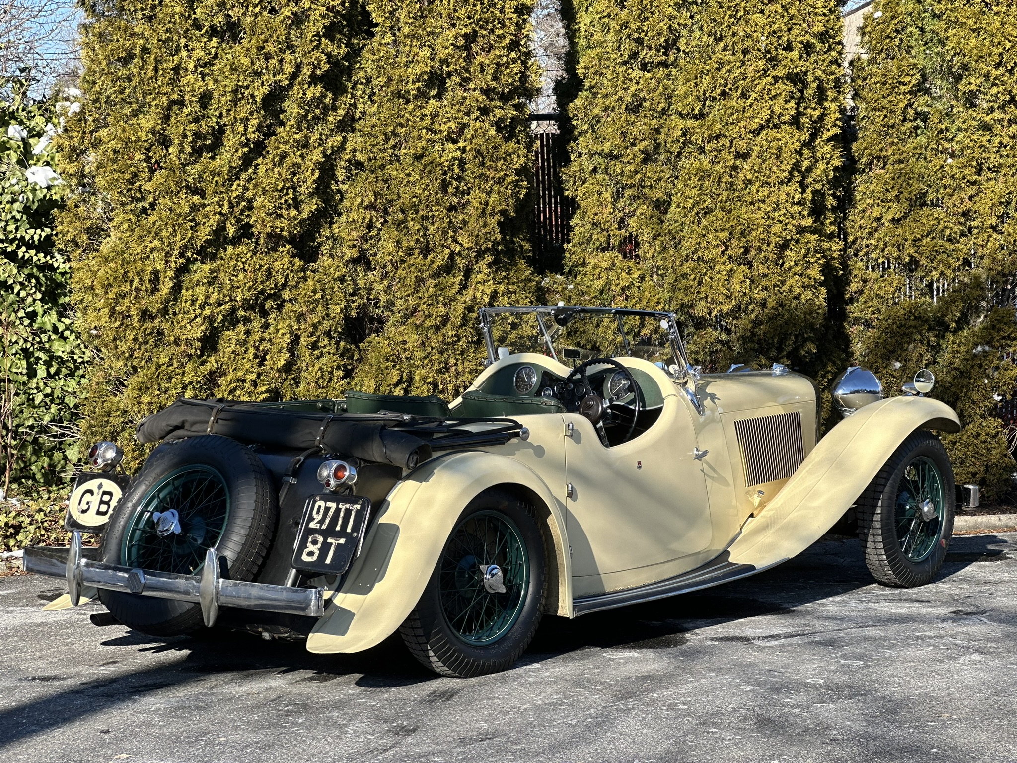 This example is finished in its factory shade of cream and is equipped with a black convertible top with matching side curtains. Features include rear-hinged low-cut doors, a louvered hood, bright front and rear bumpers, Lucas headlights with stone guards, fender-mounted side mirrors, and a black integrated trunk.