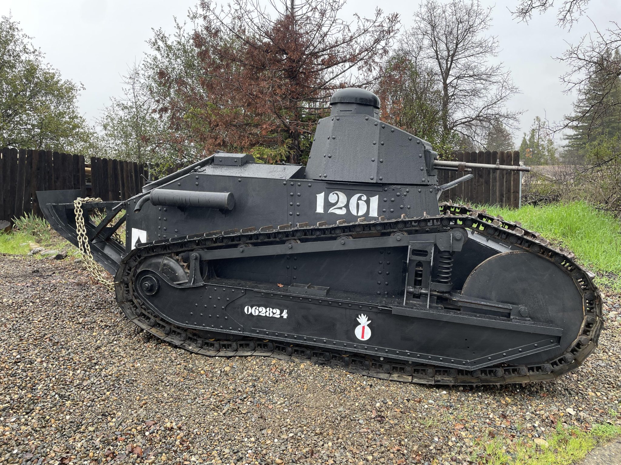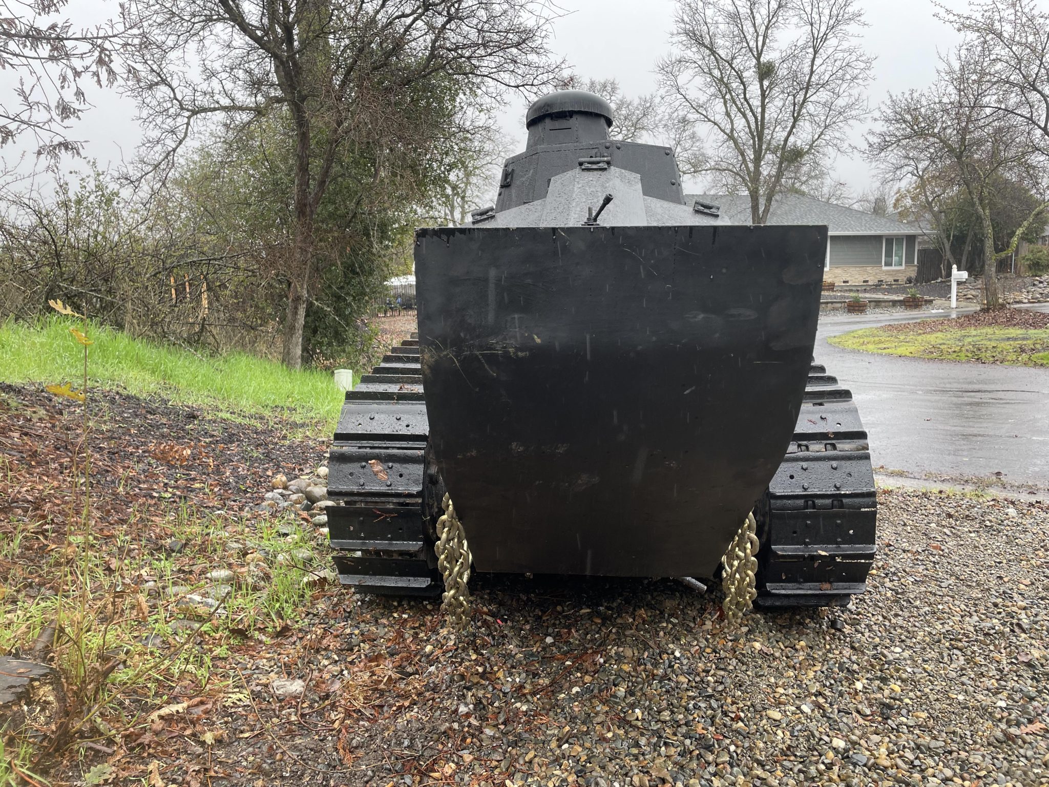 This replica’s hull, turret, and track supports were fabricated using steel plates ranging from 3/8” to 3/4″ thick. Measurements for the build were taken from a Renault FT displayed at the Museum of the American G.I. in College Station, Texas. Panels are joined to brackets by SAE carriage bolts and hex nuts, and the seams are welded. The vehicle is finished in black with white numerals and graphics, and it measures approximately 67″ wide, 7.5’ tall, and 16’ long with the tail section in place. Total weight is estimated at 10,000 pounds. The removable tail section is secured with steel pins, and tow hooks have been added at the front and back of the hull.