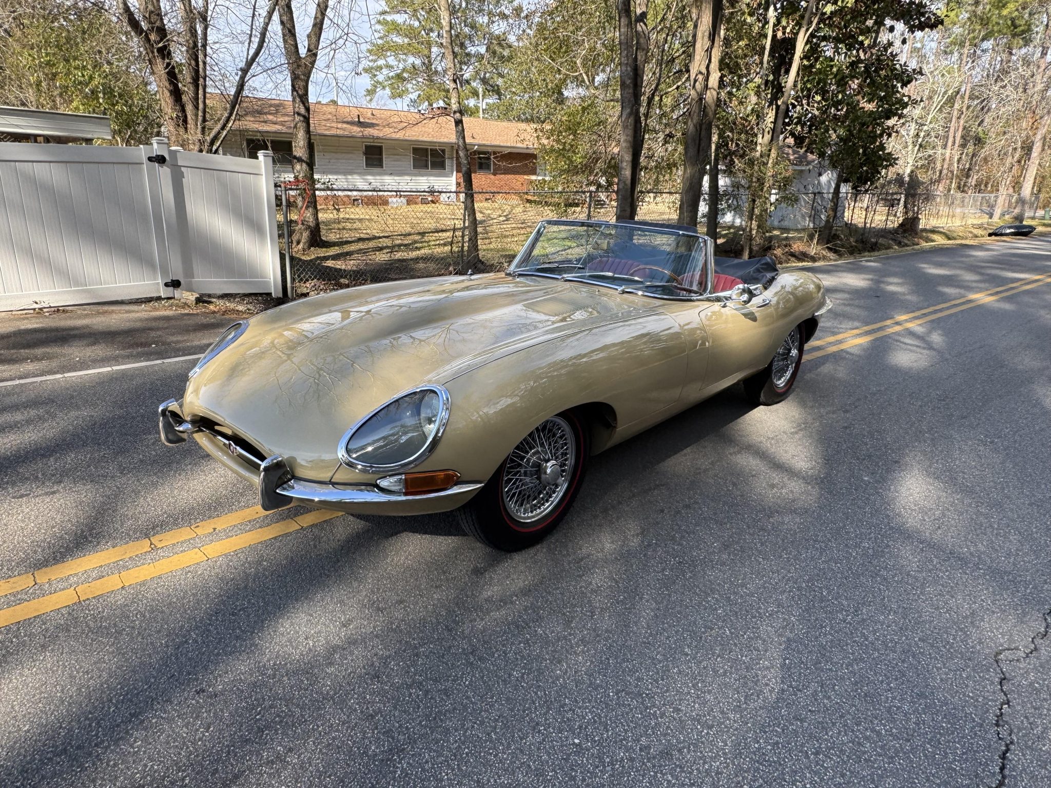 The 15″ wire wheels are secured by two-eared knock-offs and are mounted with 185R15 91S Coker Classics redline tires that show date codes from 2007. Braking is provided by four-wheel discs with inboard-mounted rear rotors. The seller notes failing chrome finish on the center caps.