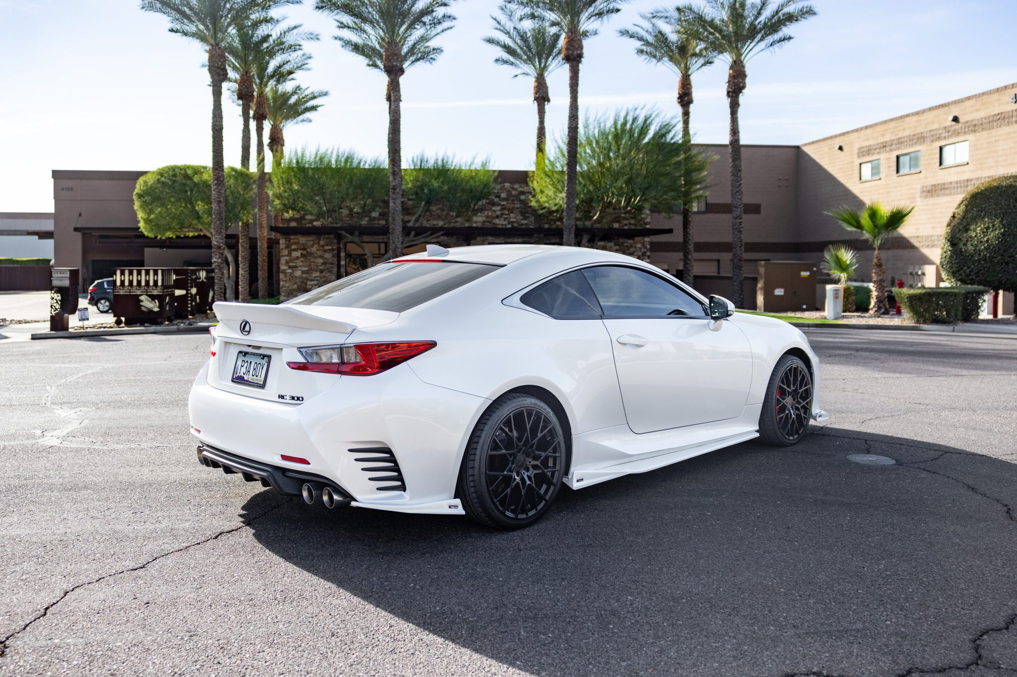 The car is finished in Eminent White Pearl and has been modified with an NIA rear spoiler and lower bodywork along with an RC350-style grille and a rear diffuser. Additional details include a rearview camera, quad exhaust outlets, LED headlights, tinted windows, and a sunroof.