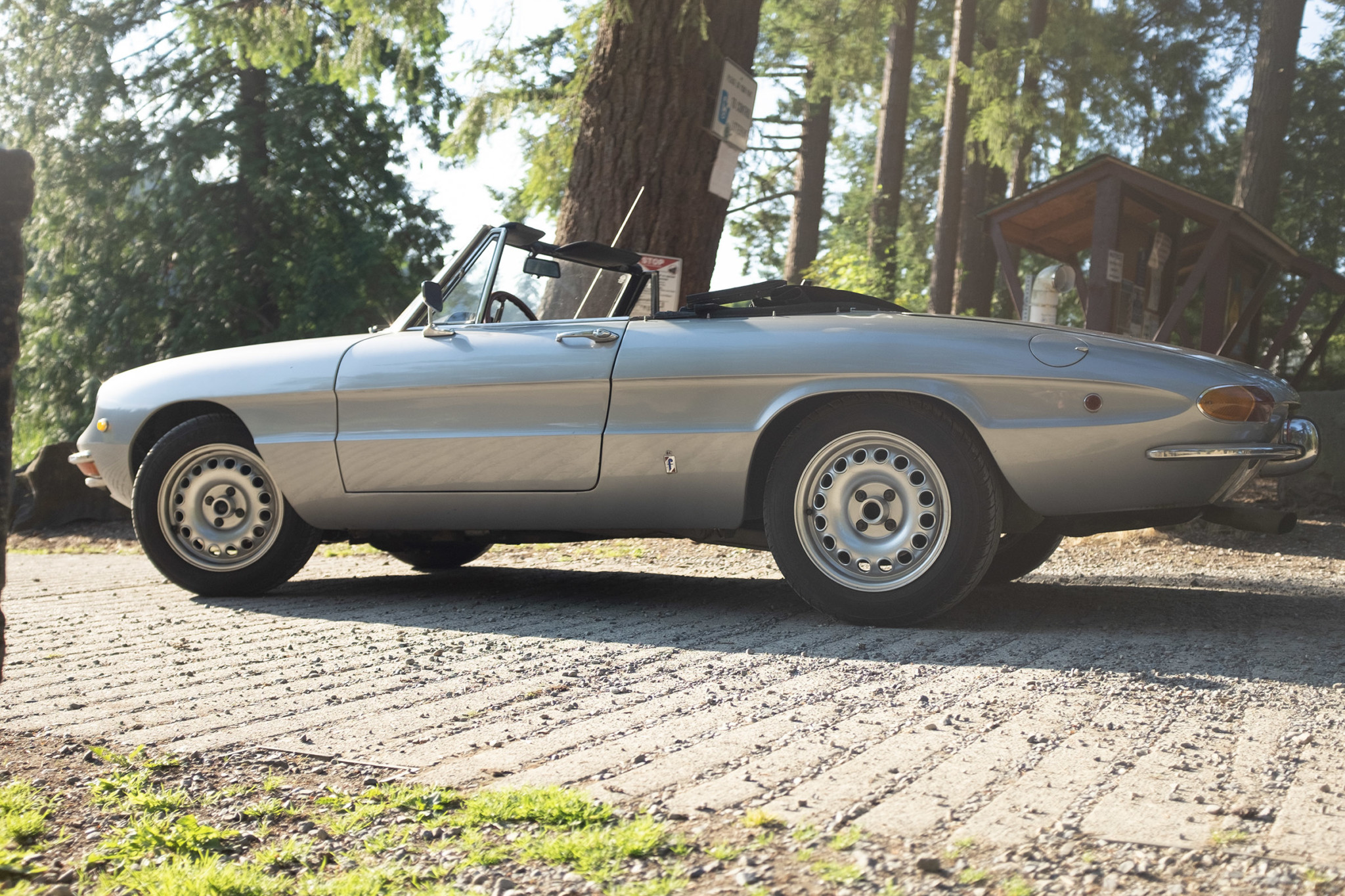 Aluminum 15″ wheels from Alfaholics are mounted with Bridgestone Potenza tires. The black canvas soft top was replaced in 2010 and is pictured in the gallery below both raised and lowered, along with an image of the rear window. One of the convertible frame brackets needs to be repaired as the cast thread has cracked off. A factory top boot, a new Re-Originals top boot, a matching Alfaholics spare wheel, and a set of stock 15″ Spider 1600 wheels are included in the sale.