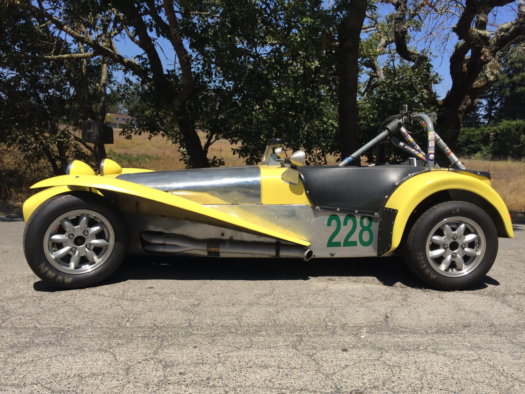 Silver Minilite-style wheels wear Avon racing tires. Modifications include a DSK adjustable front suspension, a Ford Cortina rear suspension, front disc brakes, TR-10 rear drums, an adjustable rear sway bar, and a spherical rear A-frame pivot bearing. Spare wheels and tires are included in the sale.