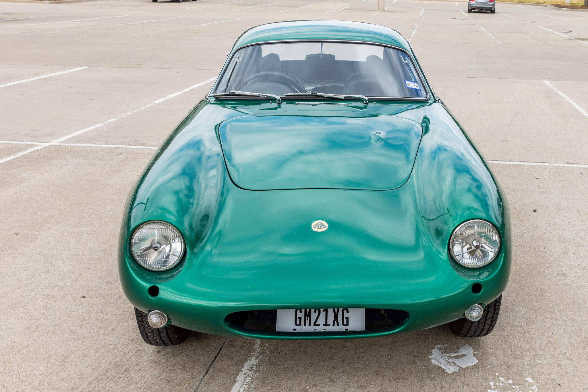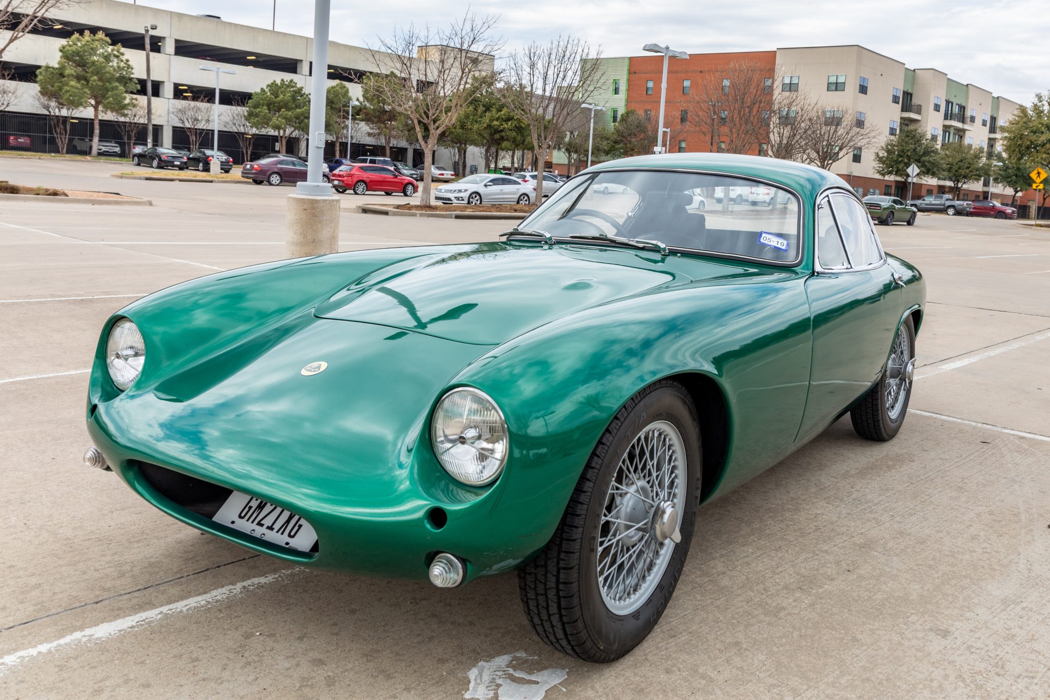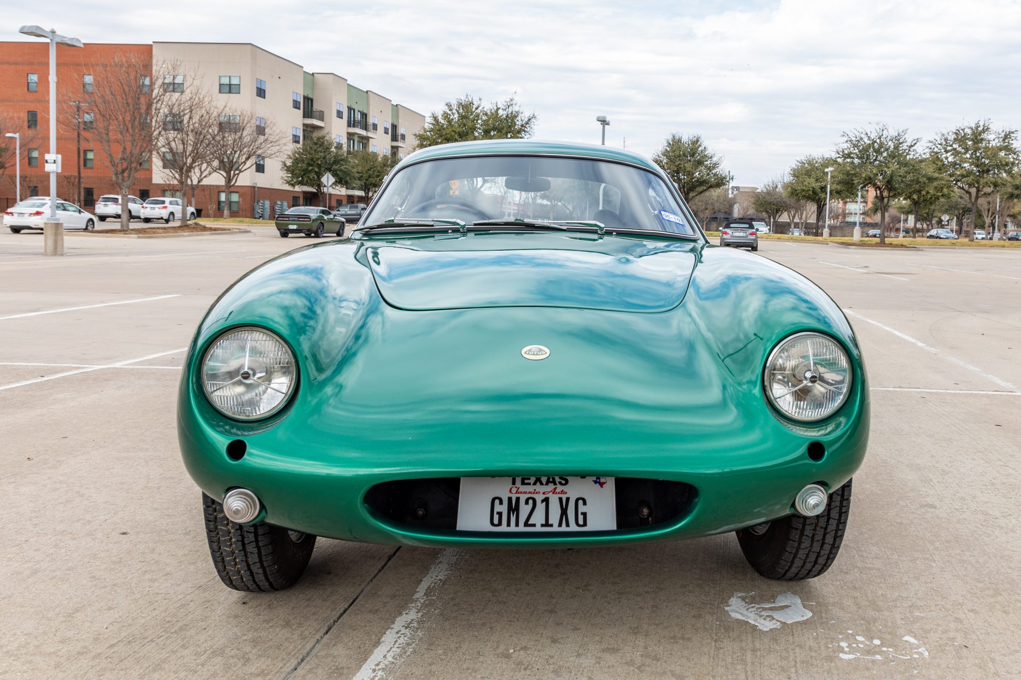 This example has been modified with custom headlight apertures, and the bumperettes and chrome grille surround have also been deleted. The metallic green finish was applied during the refurbishment, at which point some of the brightwork was re-plated and the windshield and rear window were replaced. Stress cracks are noted on the hood, rear window surround, and passenger-side door button.