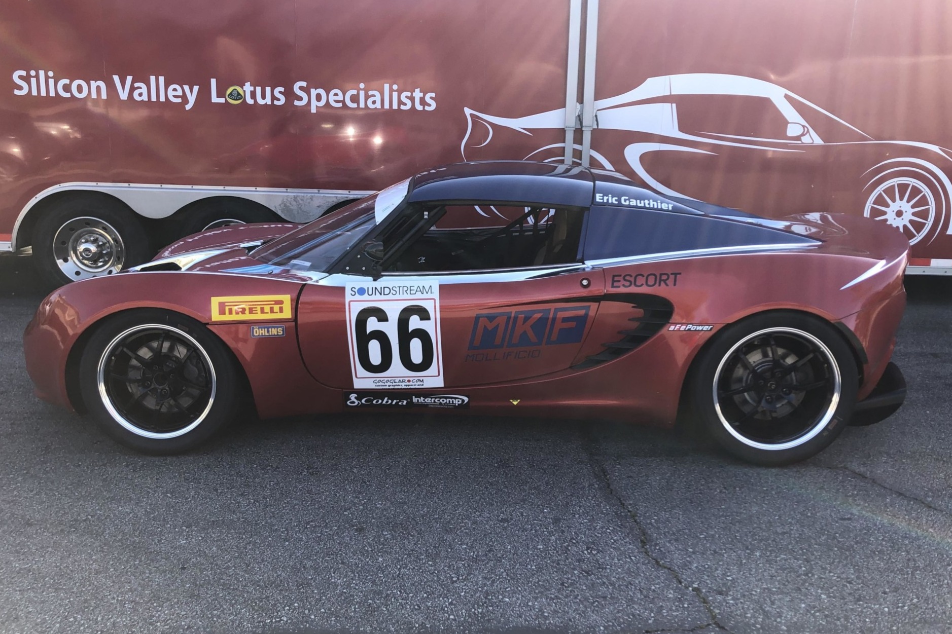 Black 16″ wheels are fitted with Pirelli slicks all around, and a separate set of wheels with rain tires is also included in the sale. Braking components include Girodisc front rotors, while suspension features three-way-adjustable Öhlins dampers as well as modified rear lower A-arms with integrated toe links.