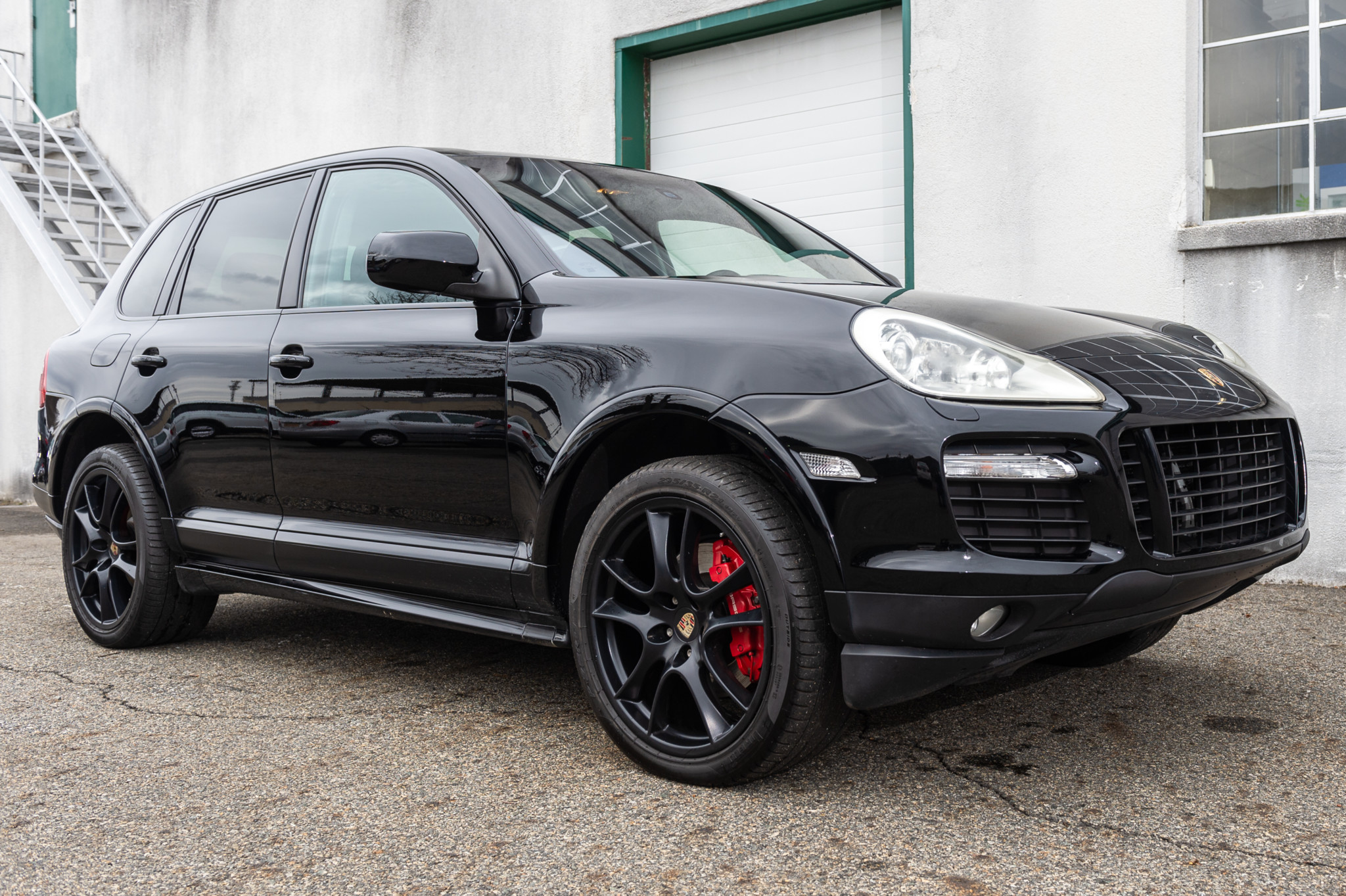 Black 21″ GTS wheels wear colored-crest center caps and Pirelli P Zero tires with 2016 date codes, and curb marks are shown in the gallery. A space-saver spare is located under a panel in the cargo area. Another set of 18″ Cayenne wheels powdercoated black in 2019 and wearing Bridgestone Blizzak winter tires is included in the sale. The front suspension air springs were replaced with new Porsche parts and the brake fluid flushed in 2019.