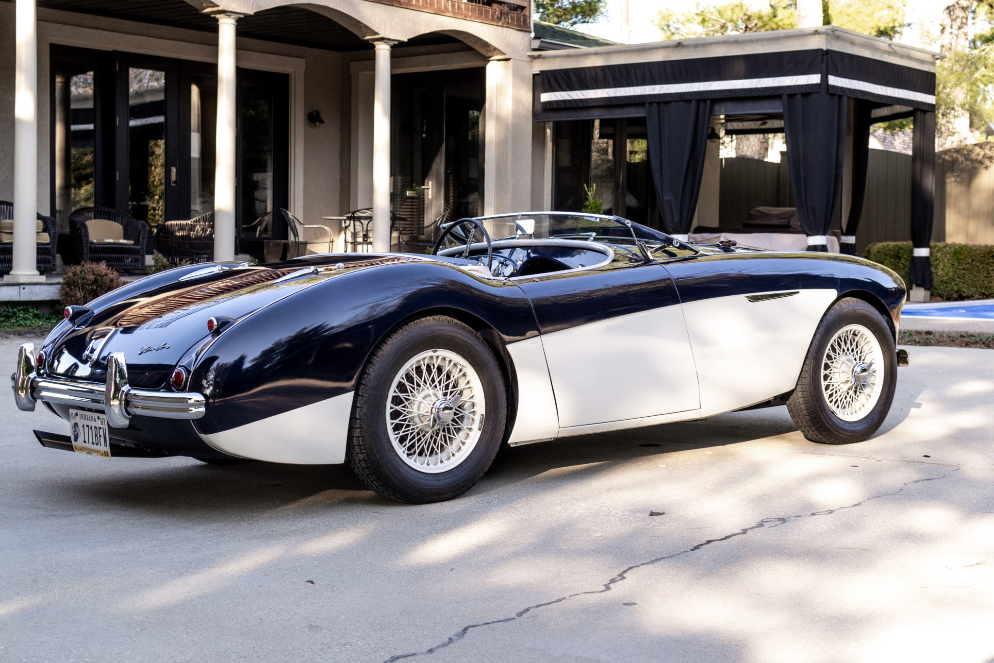 Features include a louvered hood with a leather strap, a fold-down windshield, and chrome bumpers with overriders. White-painted 15″ knock-off wire wheels wear Dunlop SP 4 radial tires. A matching spare is included in the sale, along with a mallet and a wooden hub protector.