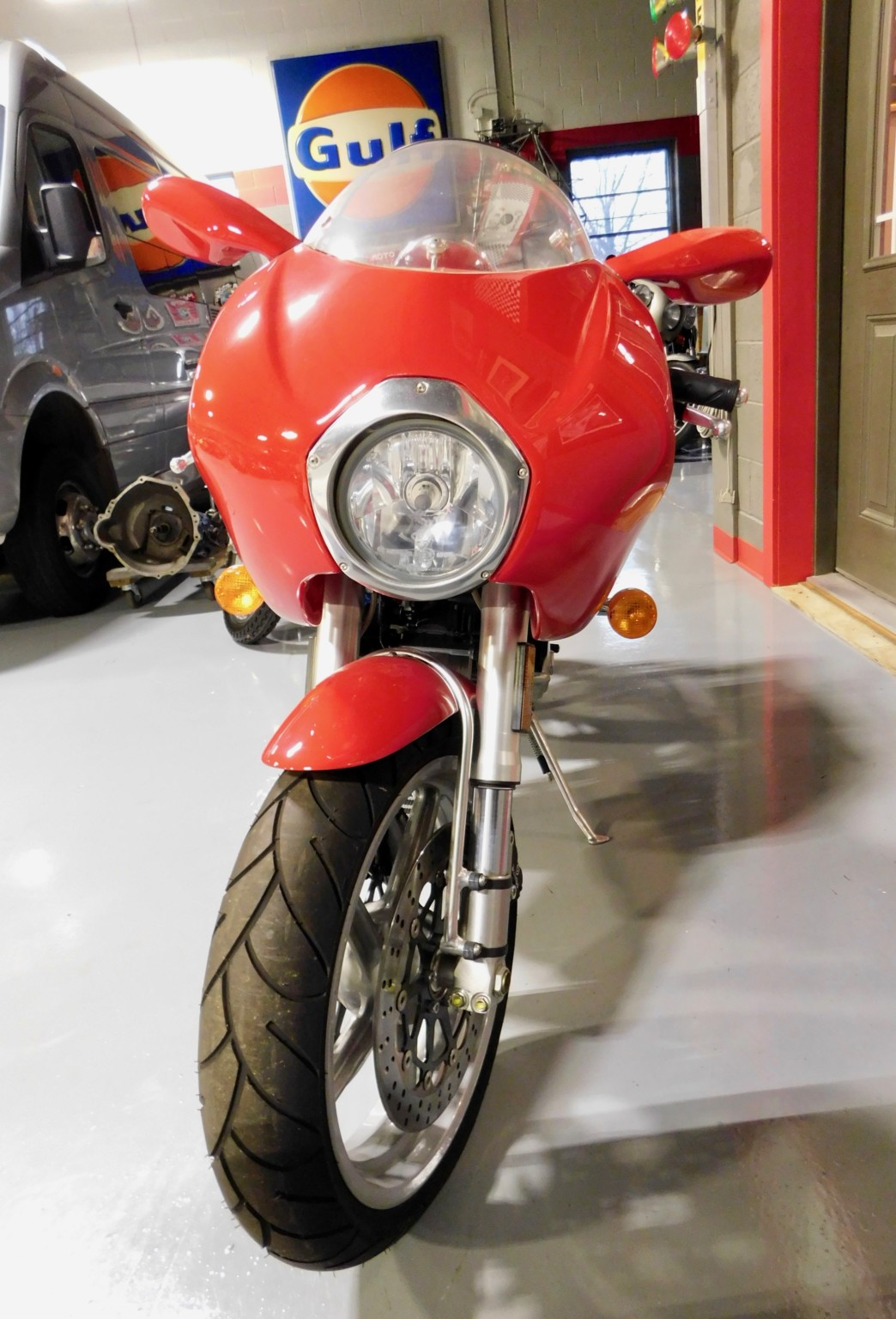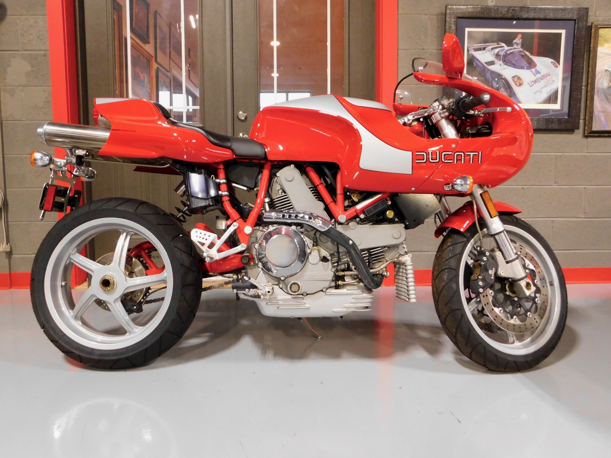 Suspension consists of an inverted fork as well as a single-sided swingarm with an adjustable shock absorber. Marchesini wheels are shod with older Michelin Pilot tires, and twin Brembo disc brakes are featured up front. A polished engine cover and upper triple tree were fitted at the factory.
