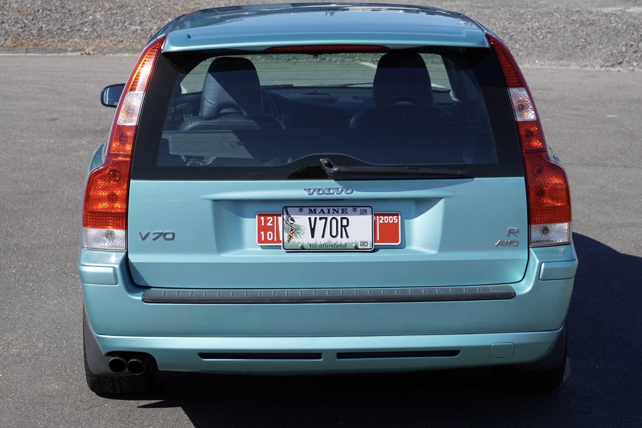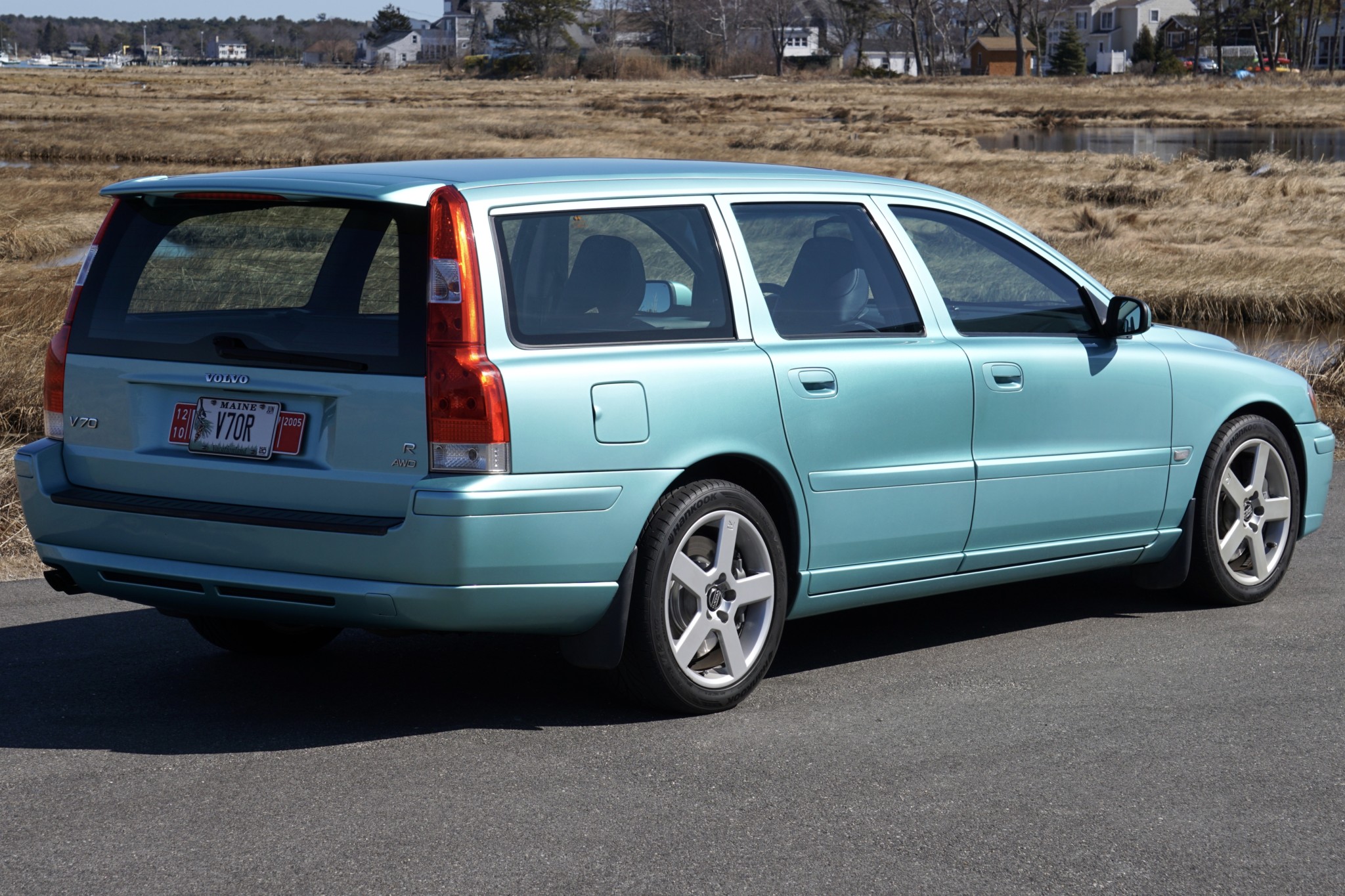 Factory 17″ Pegasus wheels are wrapped in Hankook Ventus V12 Evo tires. The seller notes curb rash on the wheels as well as damage to the sidewall of the passenger-side rear tire as shown in the gallery. Four-piston Brembo brake calipers came standard on the V70R, along with variable chassis-management profiles. The rear brake pads and rotors are said to be newer items.