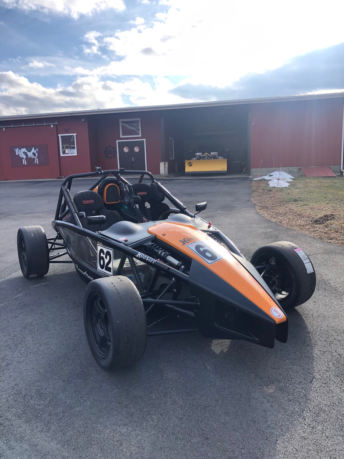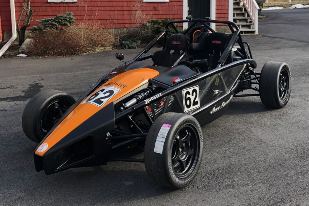 15″ SRA-specific 5-spoke wheels are mounted with Hoosier R7 tires. The suspension features double unequal-length wishbones front and rear, along with inboard coilovers. Braking is handled by Wilwood Dynalite calipers and Hawk DTC pads, and bias can be adjusted from inside the cabin. The seller notes a left rear toe link failed in 2013 and was repaired with upgraded units by TMI AutoTech. Two additional sets of wheels are included in the sale that are shown in the gallery below, along with two sets of Hawk DCT30 brake pads and one set of DCT-70 pads.