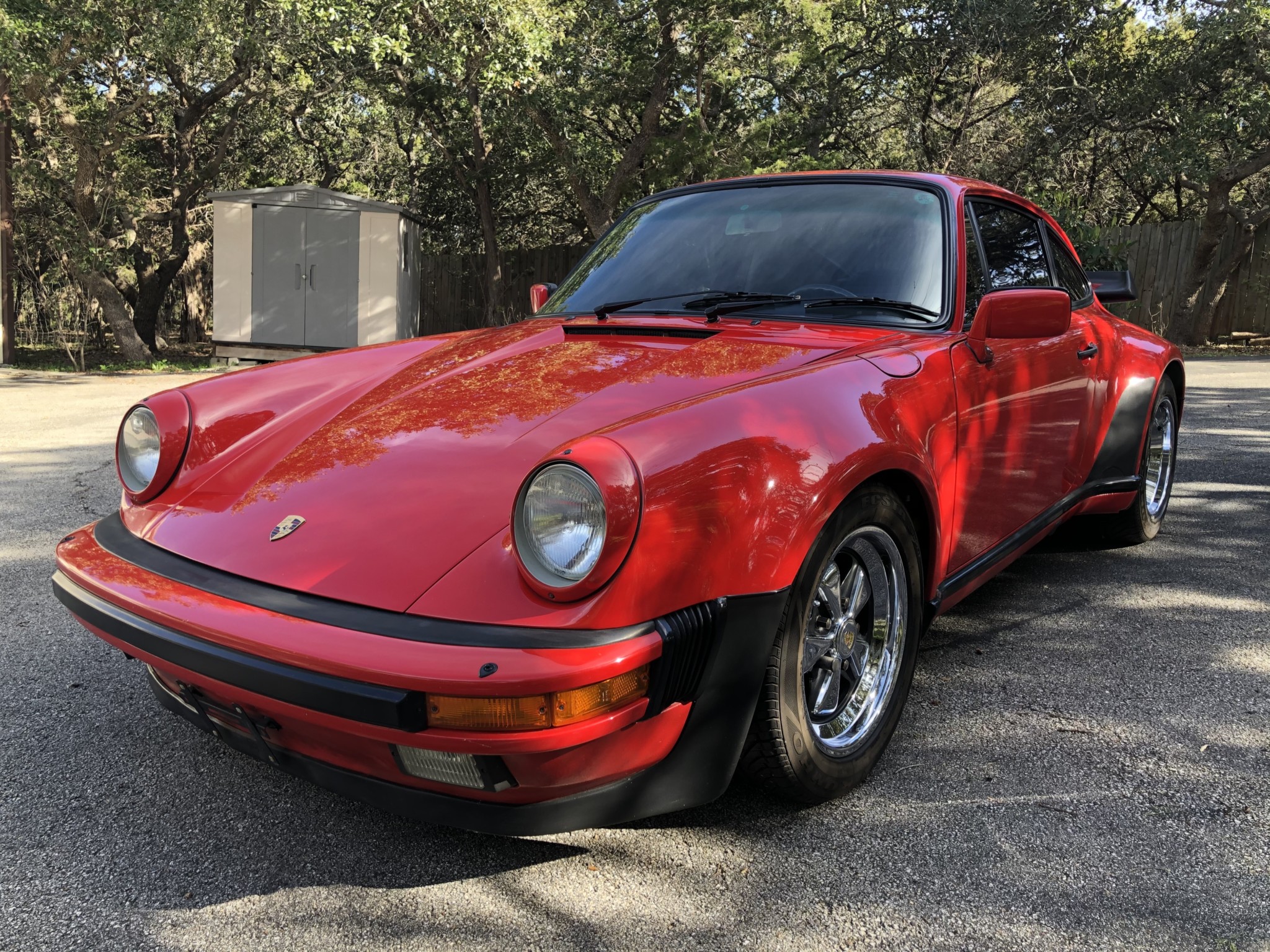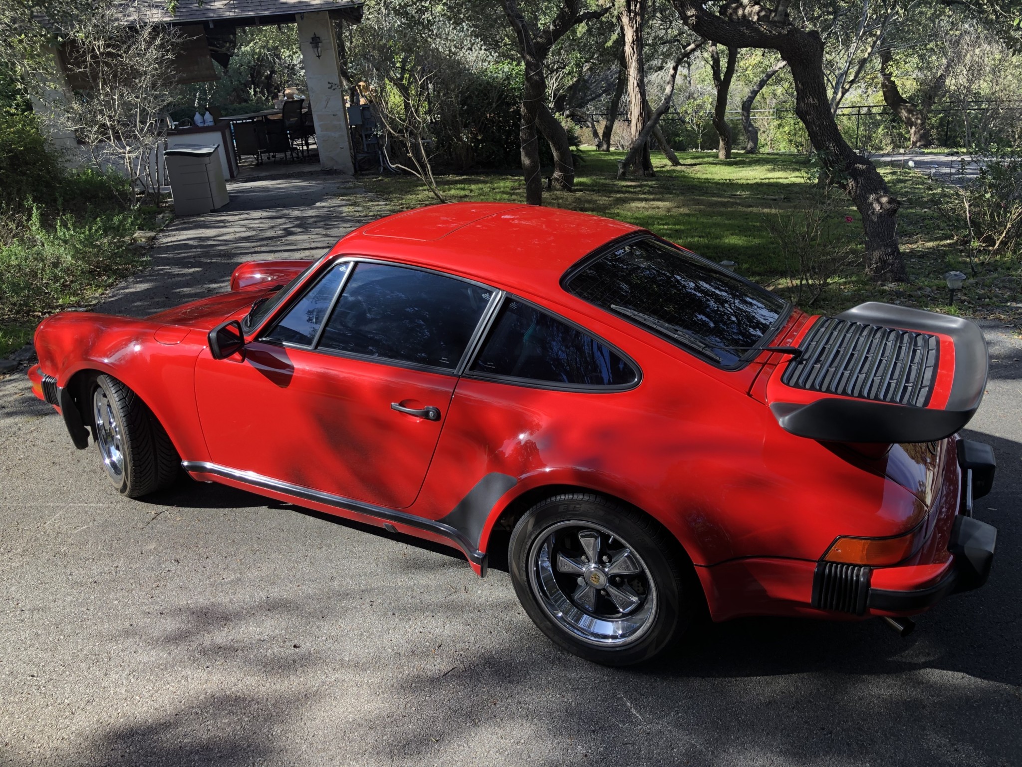 Staggered-width 16″ Fuchs wheels were refinished in chrome under previous ownership and are wrapped in Kumho Ecsta Supra tires, which the seller states are approximately 12 years old and should be replaced due to age. The M491 package included suspension components and drilled brake rotors from the 930 Turbo model.