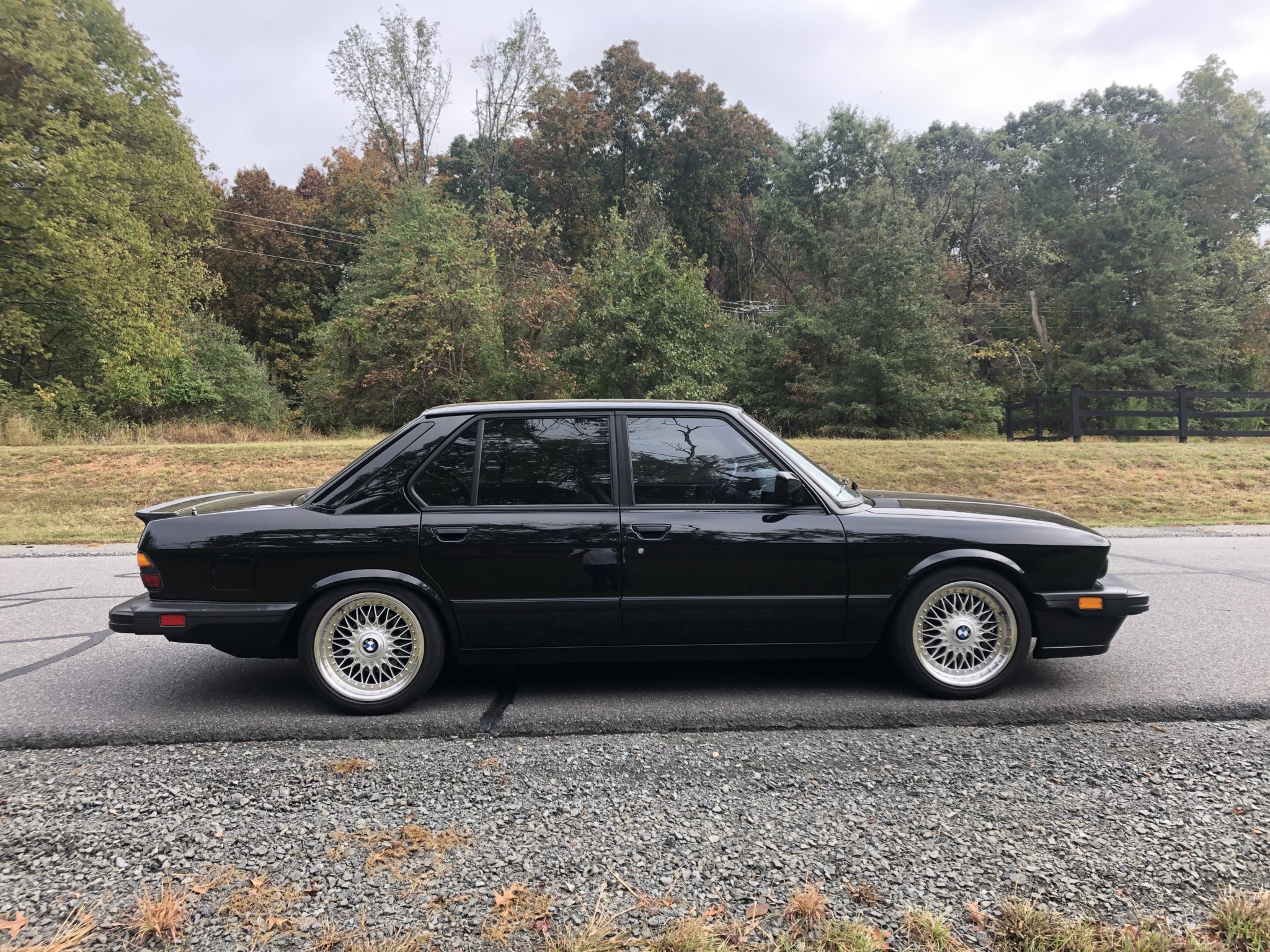 Replacement 17″ BBS RC090 wheels wear BMW center caps and Michelin Pilot Sport A/S 3+ tires that were mounted in February 2020. A factory 16″ spare wheel with Pirelli P700 rubber is located in the trunk. The stock self-leveling suspension was replaced with Dinan coil springs under previous ownership, and service in 2019 included installation of a new Pitman arm bushing, front control arms, and sway bar end links.